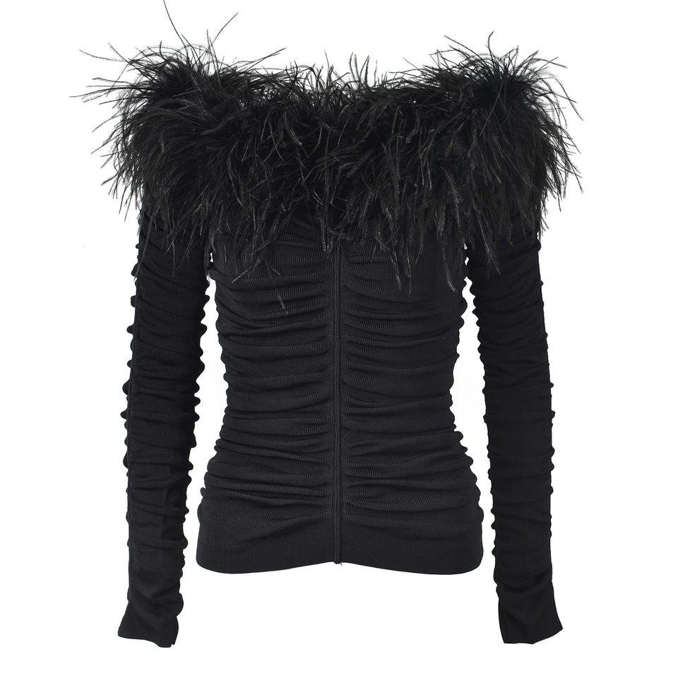 2026 Sexy Designed Boat Neck Lady Slim Fitted Feather Decorate Cloth Long Sleeve Women Pullover Solid Knits Shirts