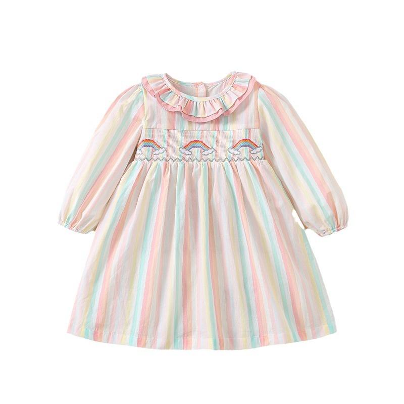 Abito da bambina in cotone con ricamo a cartoni animati arcobaleno, gonna a righe colorate con coulisse, nuova collezione primavera autunno 2026