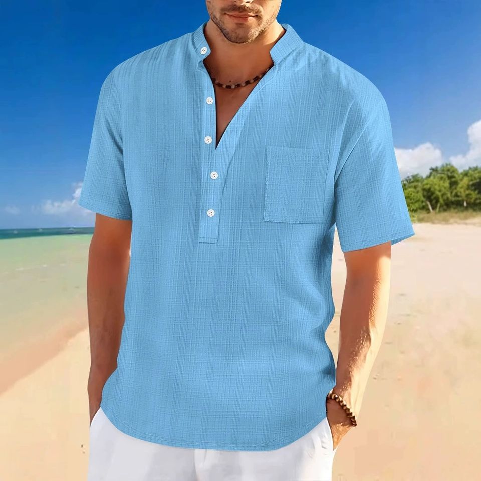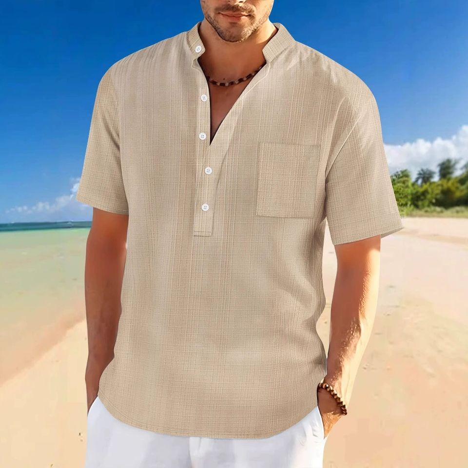 Camicia Henley da uomo estiva 2026 a maniche corte con colletto alla coreana in tessuto di lino effetto bambù, vestibilità ampia e casual