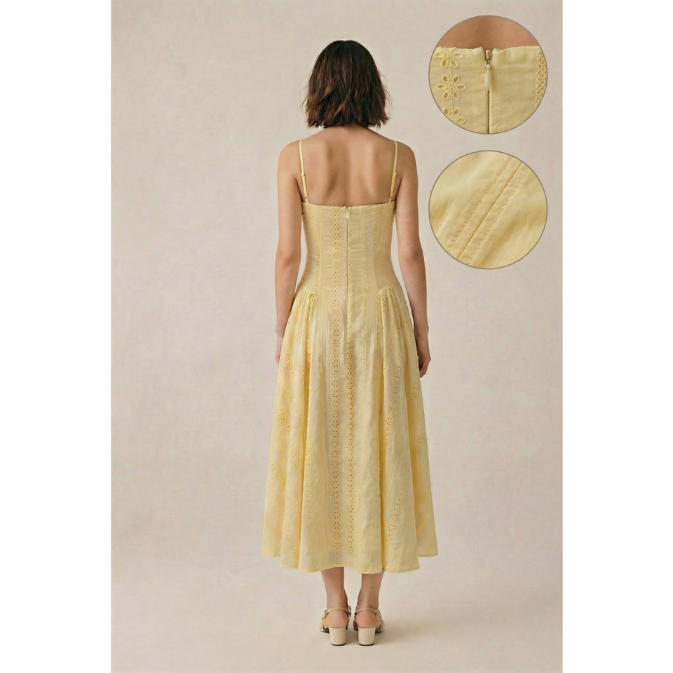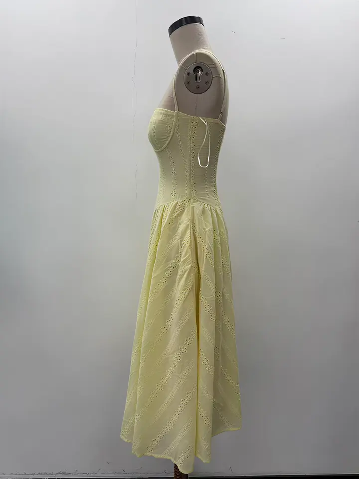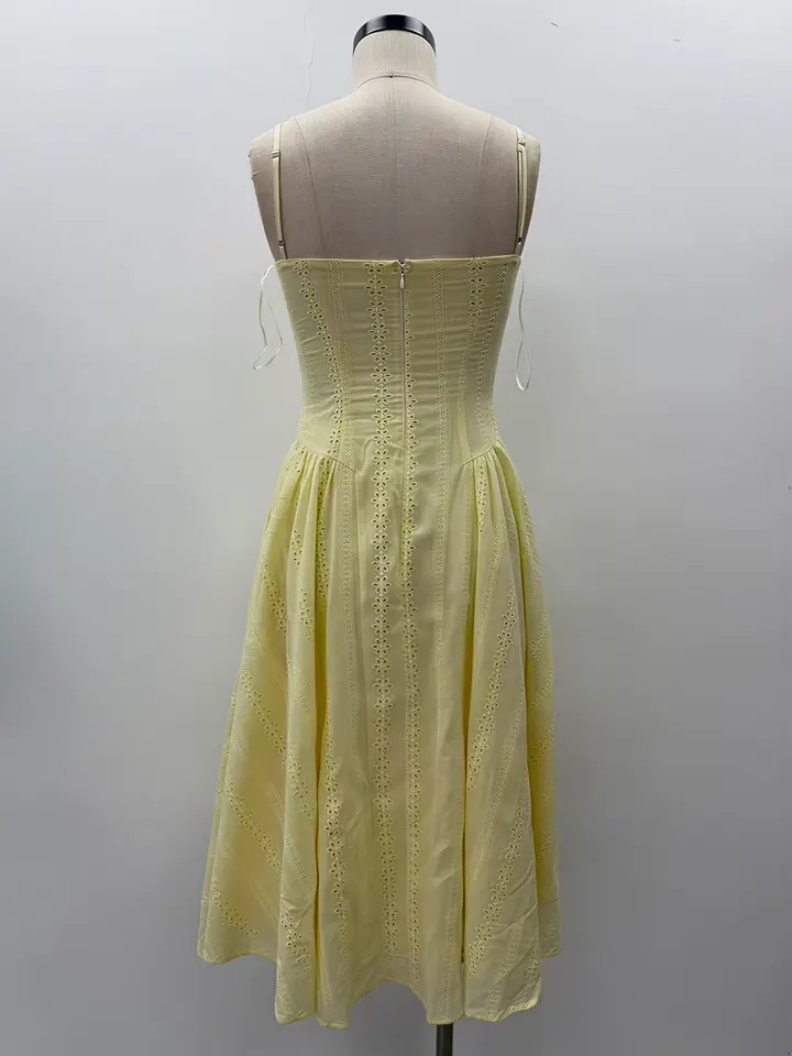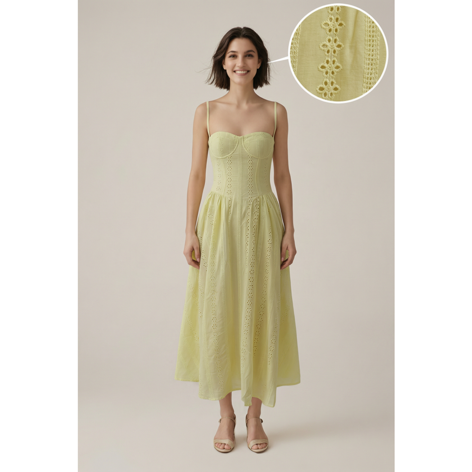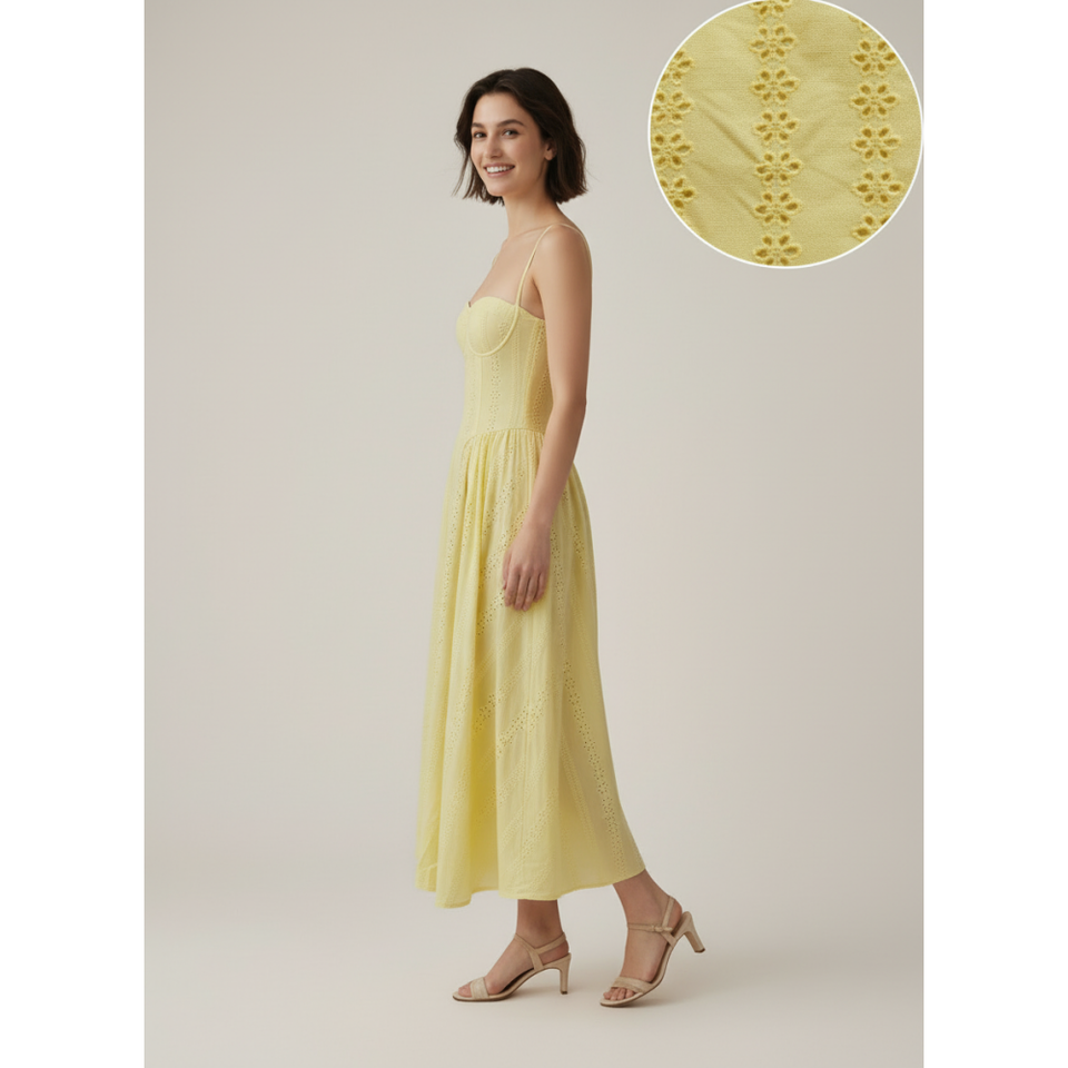 Abito Midi Estivo 2026 in Cotone Giallo con Occhielli, Elegante Vestito da Donna con Scollo a Cuore, Corsetto, Spalline Sottili, per Spiaggia e Vacanze