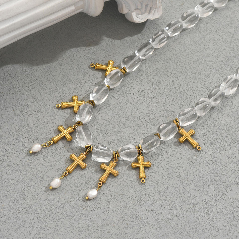 Collana Trendy 2026 con Perle e Croce Placcata Oro in Ottone, Collana Religiosa con Madonna per Donne e Ragazze