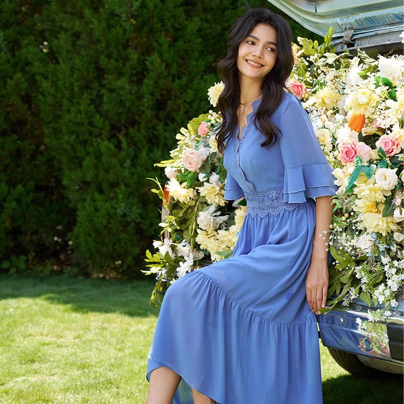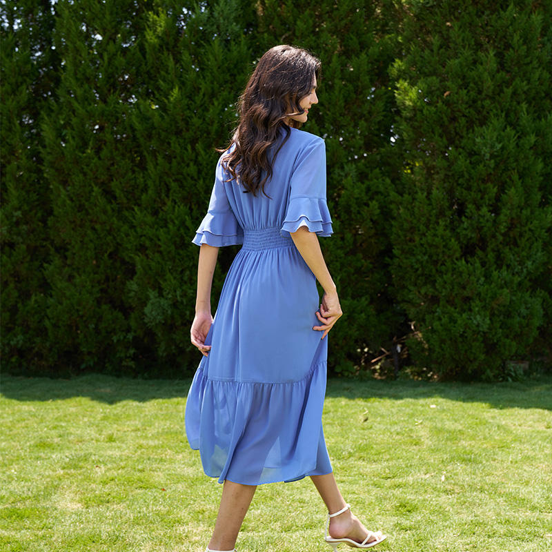 2026 V-Neck Lace Waist Maxi Romantic Dress Ruffle Flowy Short Sleeve Baby Blue Dress Women Wedding Guest Long Dress