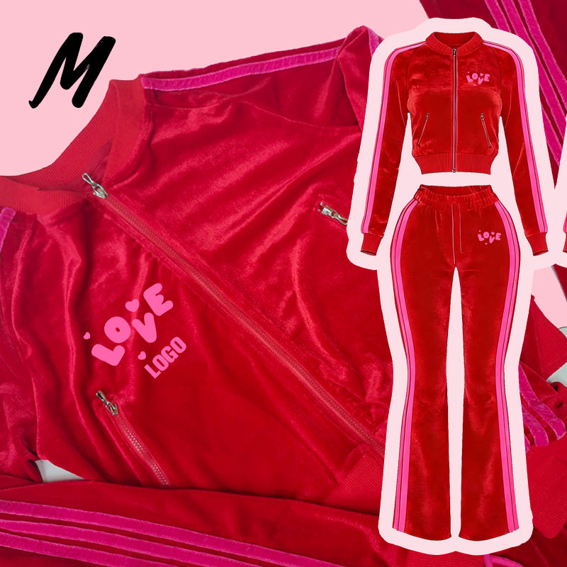 Quzhou Milady Completo 2pz velluto rosa, giacca zip + pantaloni svasati con banda laterale, logo pers., 94/6% pol./sp., XS-2XL
