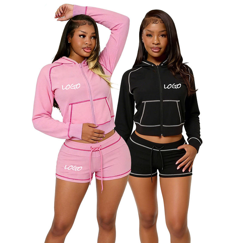 Completo da donna in maglia waffle 2026, personalizzabile con logo, set loungewear primaverile/estivo in cotone due pezzi: felpa con cappuccio e pantaloncini