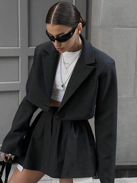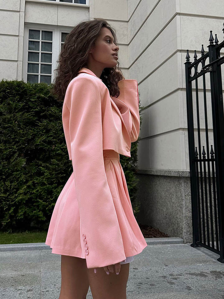 Completo da donna elegante estivo 2026 Y2K di tendenza: completo due pezzi con blazer a risvolto e gonna corta a pieghe
