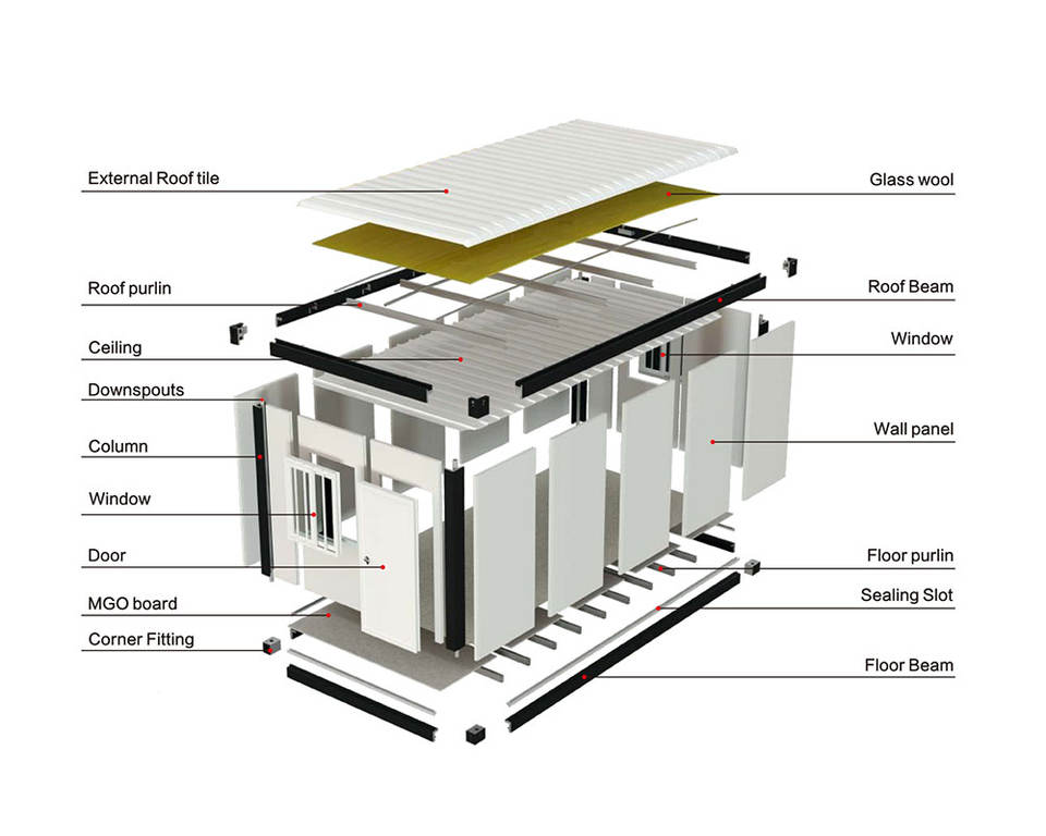 CGCH Casa prefabbricata 20ft acciaio; lamiera 0,326-0,476 mm; pann. 50-100 mm EPS/rock/PU; vento ≤120 km/h; neve 0,6 kN/m²