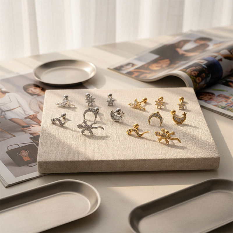 Orecchino a Perno in Acciaio Inox 20g, Regalo di Nozze, Piercing con Zirconi, Motivi Serpente, Lucertola, Geco, Fiore, Luna, per Cartilagine, Elica, Conca, Lobo, Trago