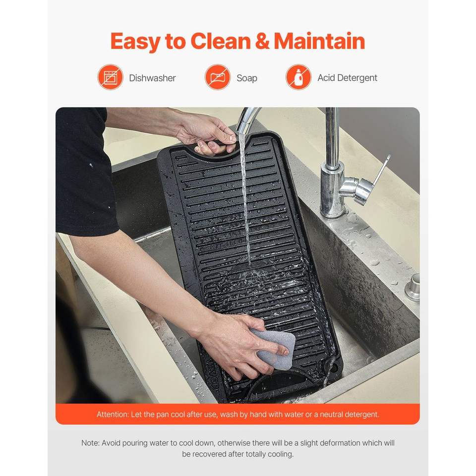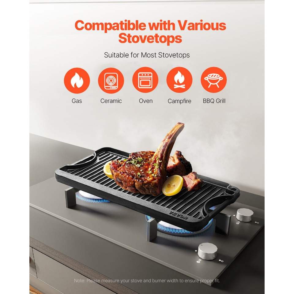 Piastra in Ghisa Pretrattata 20x10 Pollici, Griglia/Padella Reversibile Portatile con Manico, Utensile da Cucina per Famiglia