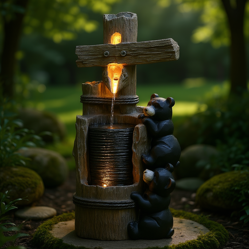 Fontana a cascata da esterno in resina a 3 livelli con orsi su tronco, luci LED e pompa inclusa, decorazione rustica da giardino