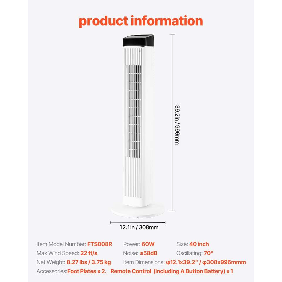 Ventilatore a Torre Silenzioso da 22 Piedi/secondo, Oscillante a 70°, 3 Velocità, 4 Modalità, Timer 12H, Portatile per Interni