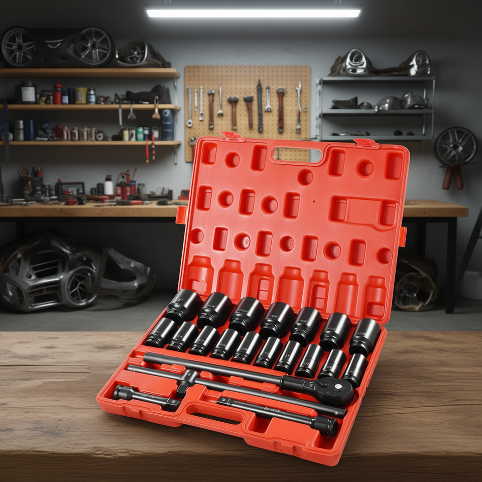Set di chiavi a bussola profonde da 22 pezzi con attacco da 3/4 pollici, misure SAE, con cricchetto e adattatori