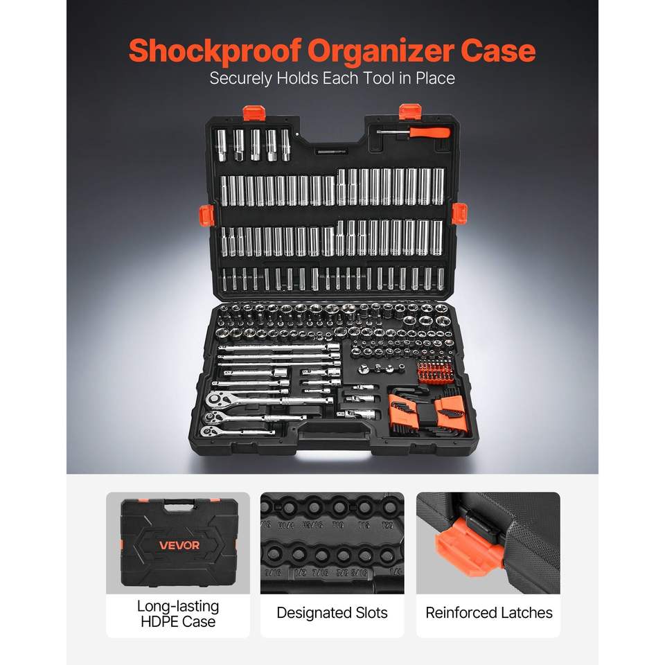 Set di chiavi a bussola da 225 pezzi con attacco da 3/8, 1/4, 1/2 pollici, metrico e SAE, profondo e corto, per meccanici, include cricchetto e bussole