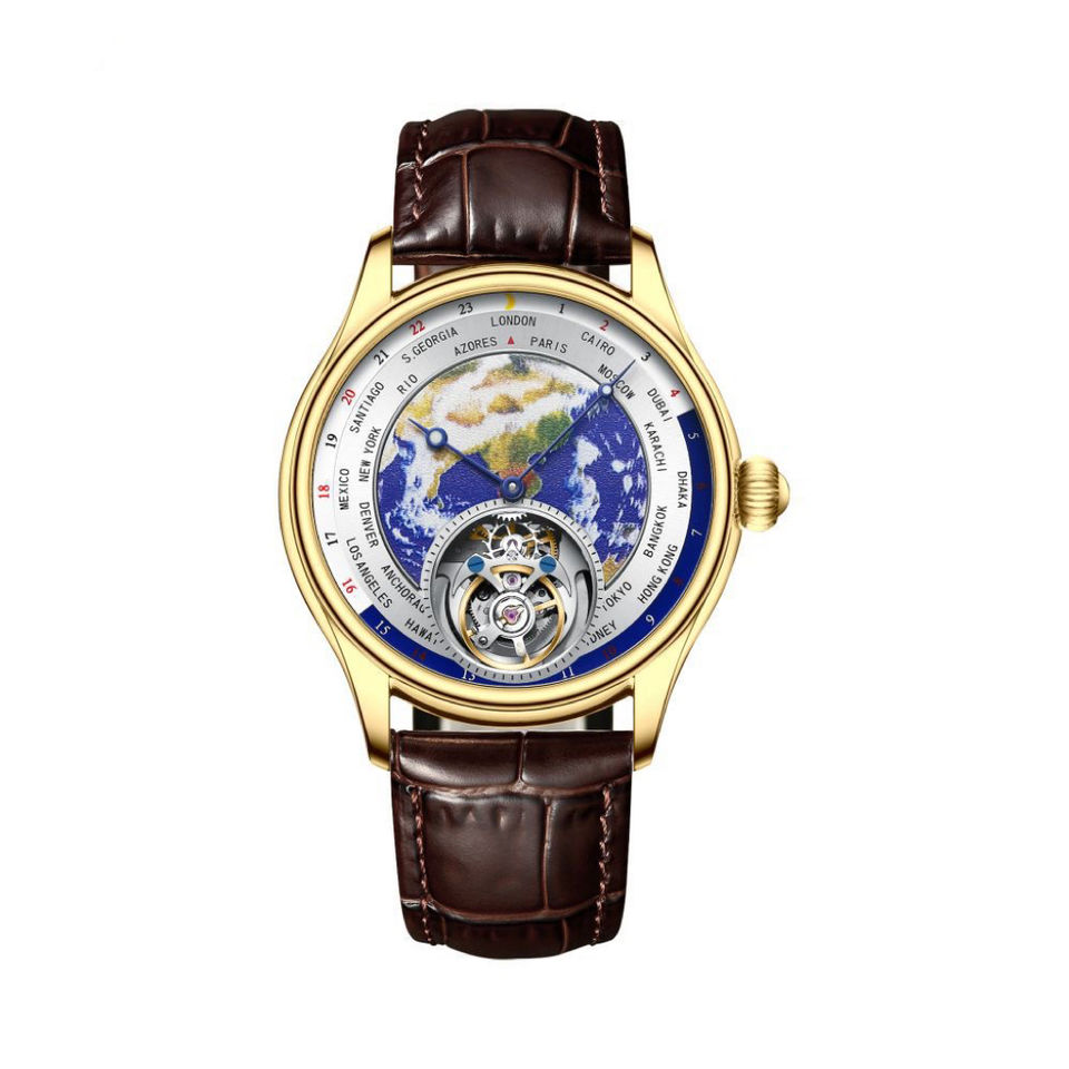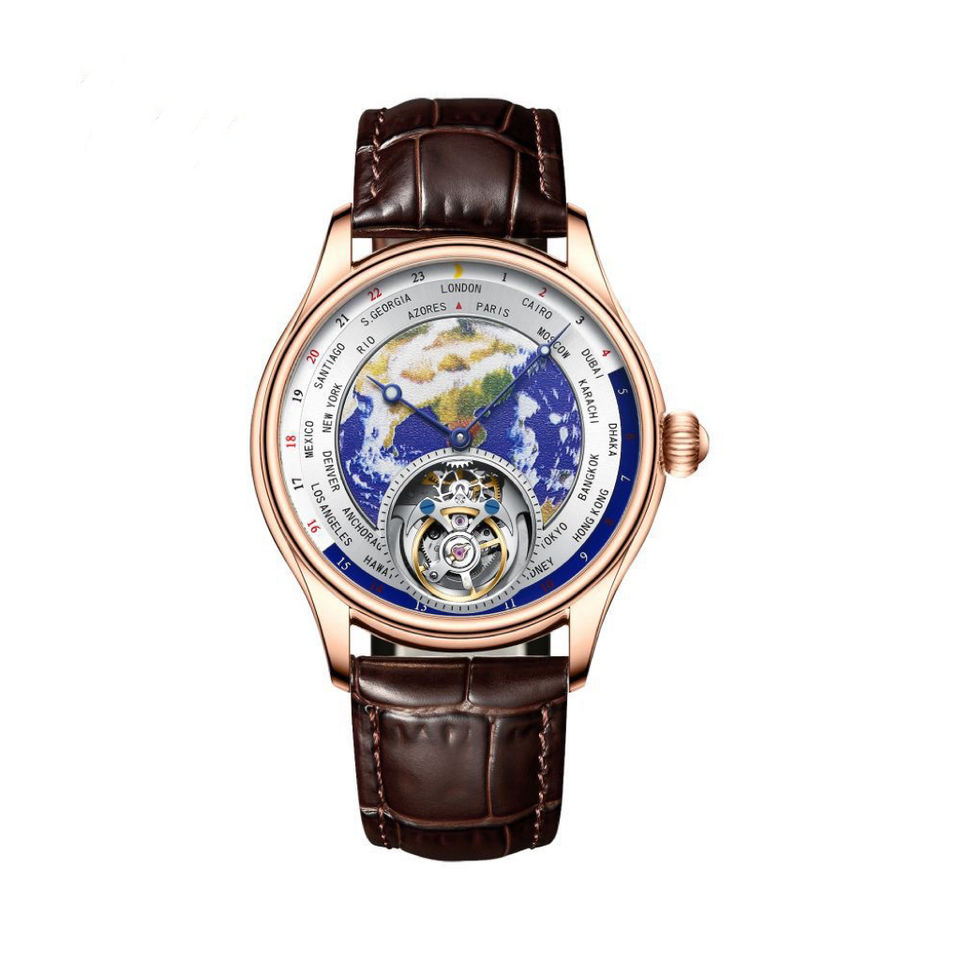 22mm Genuine Leather Strap With Butterfly Buckle Two Face Dual Dial 3D World Map 6Oclock Big Flywheel Tourbillon Watch