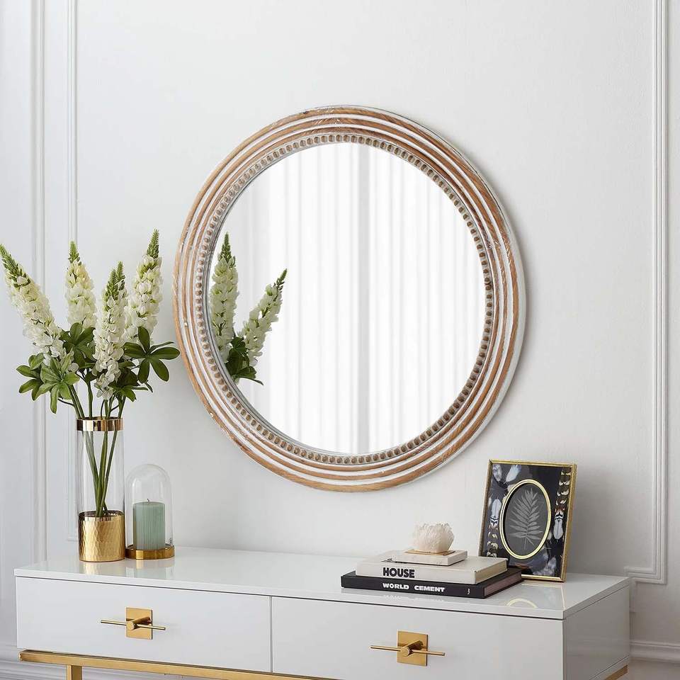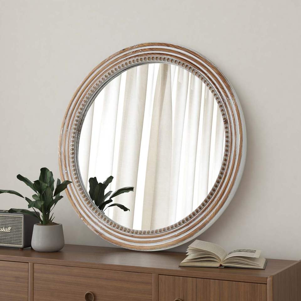 Specchio da Parete Rotondo in Legno Rustico da 23,62 Pollici, Stile Fattoria Decorativo per Soggiorno e Camera da Letto, Design con Perline