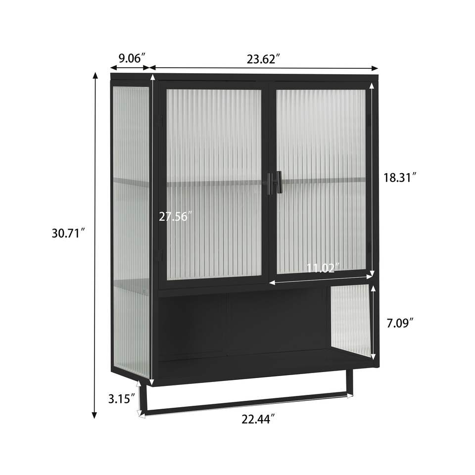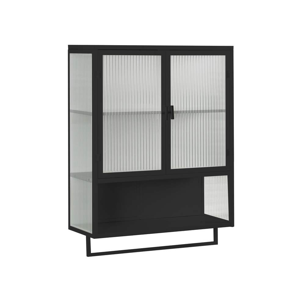 Mobiletto da parete moderno in vetro a due ante da 60 cm con spazio contenitivo a due livelli e portasciugamani aperto per bagno