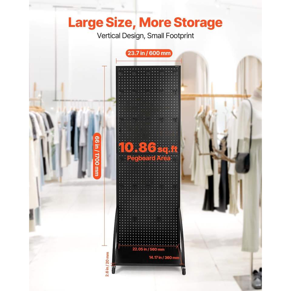 Espositore a pannello forato (pegboard) autoportante in acciaio laminato a freddo rinforzato, 23,7 x 66 pollici, con piastra di base, 30 ganci e ruote - Scaffalature espositive