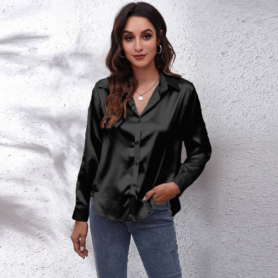 Camicia in Raso da Donna in 23 Colori e 7 Taglie Disponibili, Stile Carino a Maniche Lunghe, Vestibilità Regolare, Tinta Unita, Nuovo Abbigliamento Europeo e Americano