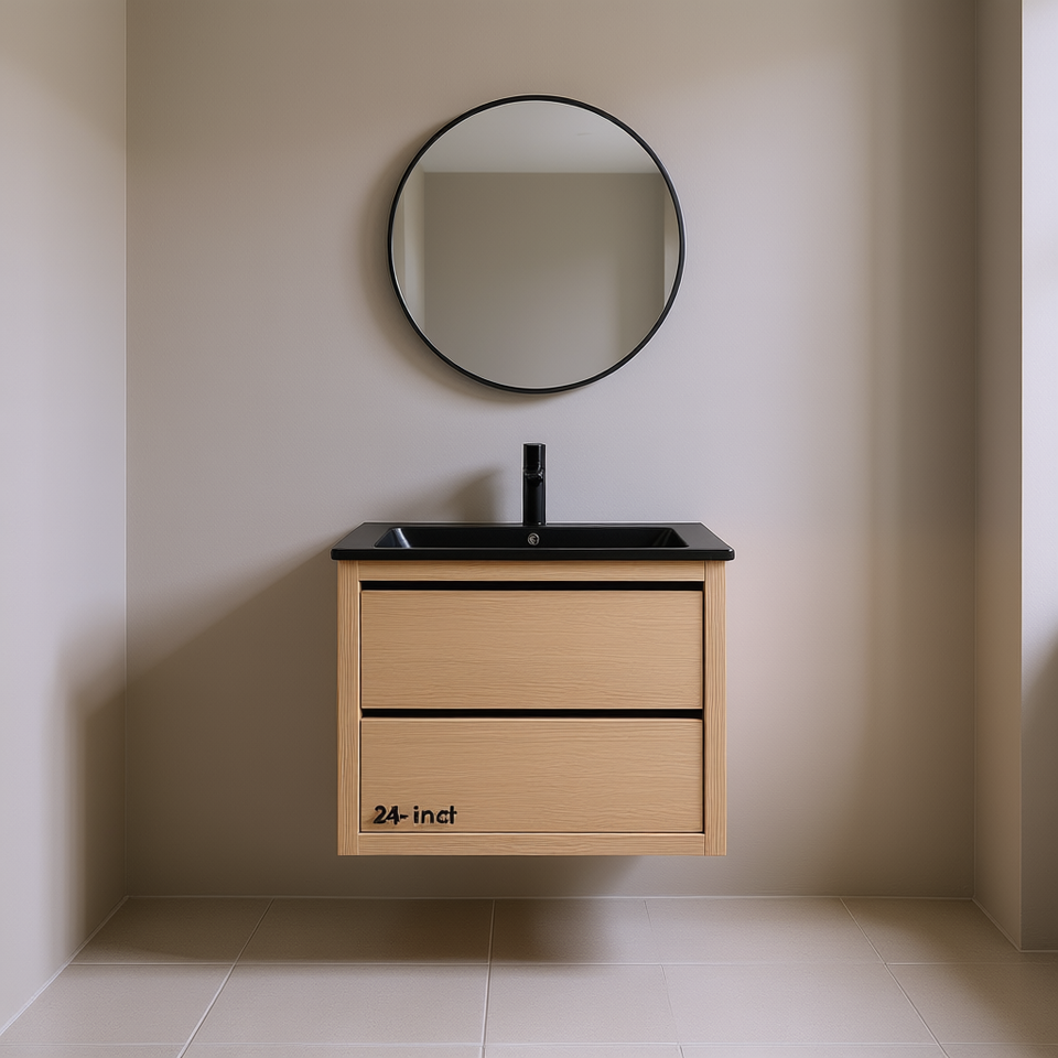 Bathroom Vanity 24 Inch Light Oak Finish With Black Ceramic Sink And Soft Close Drawers Wall Mounted Modern Minimalist Design