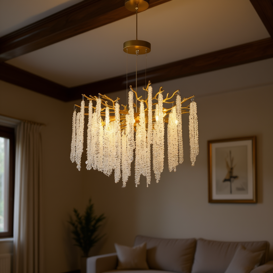 Lampadario Moderno in Ferro Dorato 24 Pollici con Fili di Cristallo a Cascata, Illuminazione Decorativa per Soggiorno