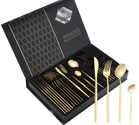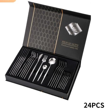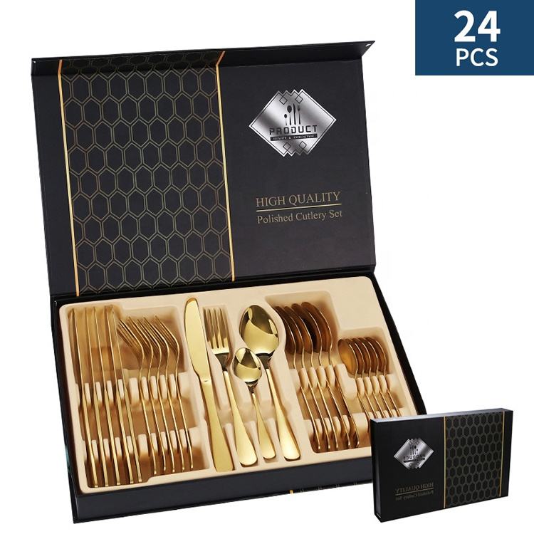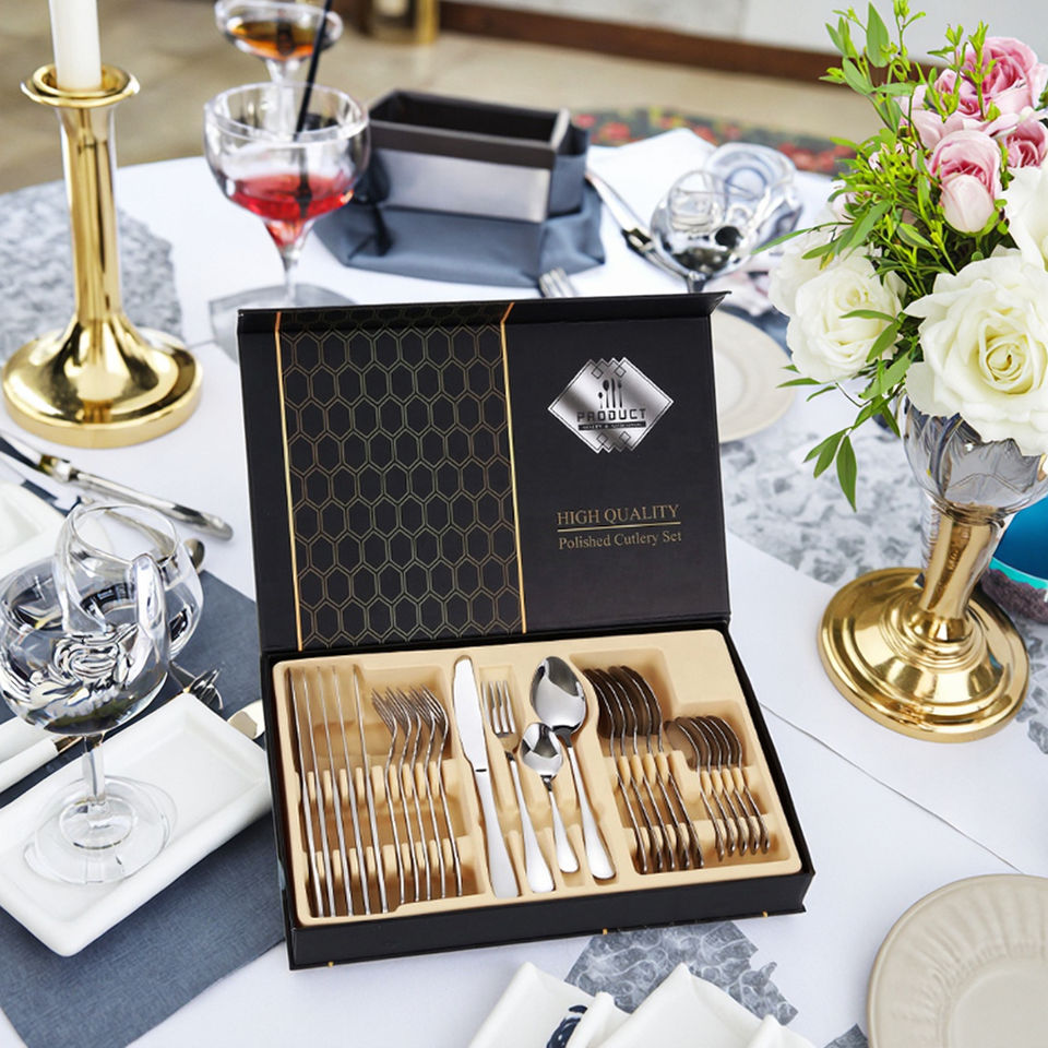 Set di posate in acciaio da 24 pezzi, popolare set di posate portoghesi con confezione regalo, include coltello, forchetta, cucchiaio e cucchiaino.