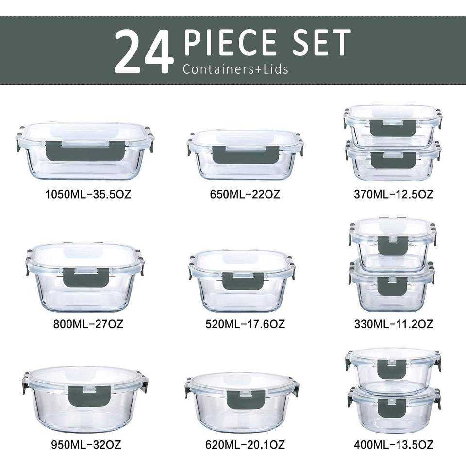 Set di 24 Contenitori in Vetro per Preparazione Pasti con Coperchi a Chiusura Ermetica Migliorati, Contenitori per Alimenti