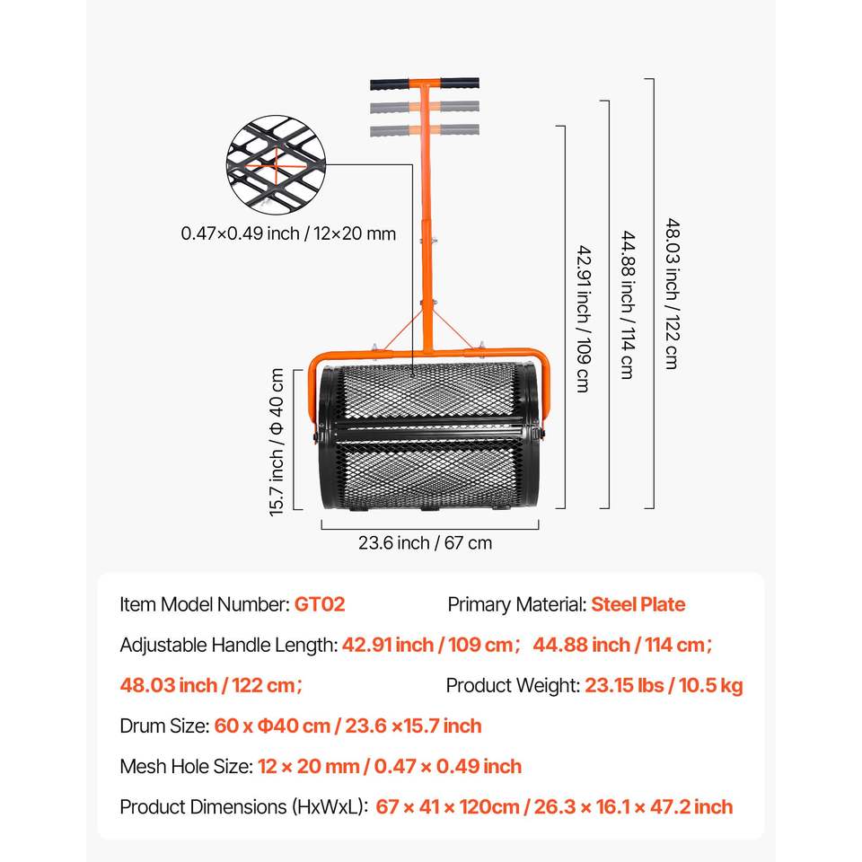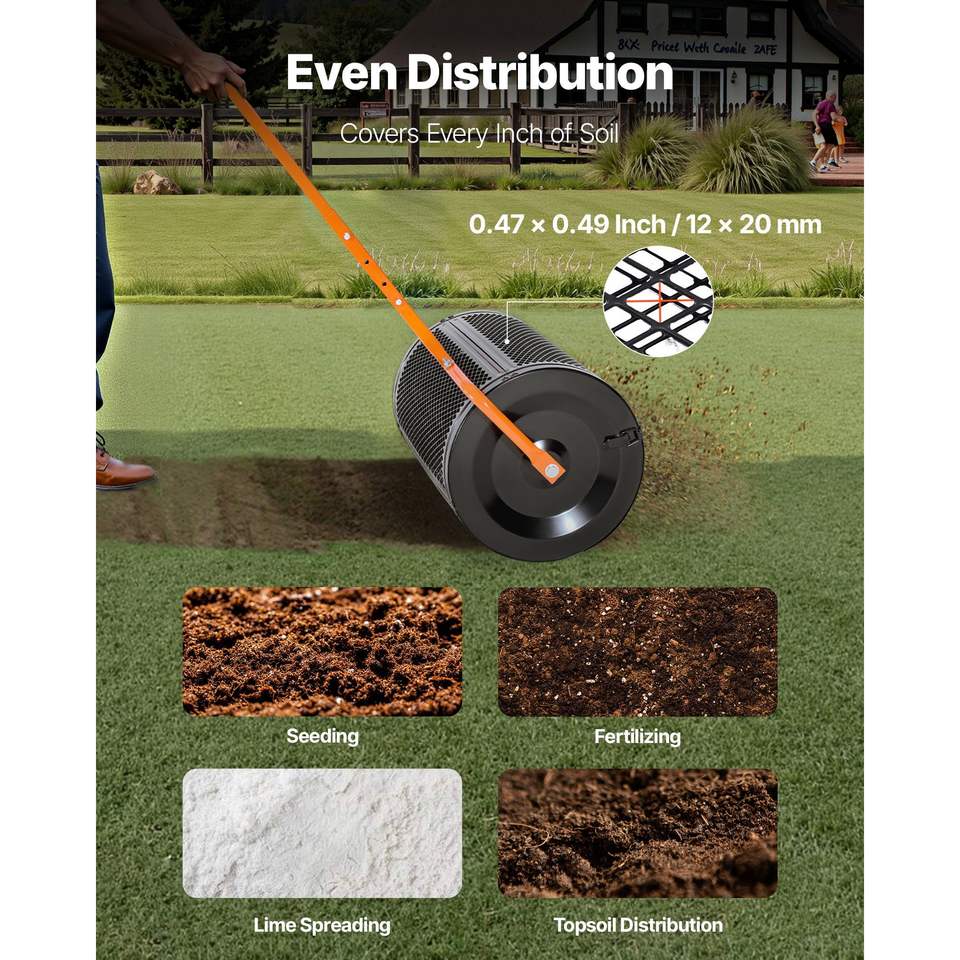 Spargitore di compost e torba da giardino largo 24 pollici con manico a T, regolabile in 3 altezze, in acciaio verniciato a polvere per fertilizzanti
