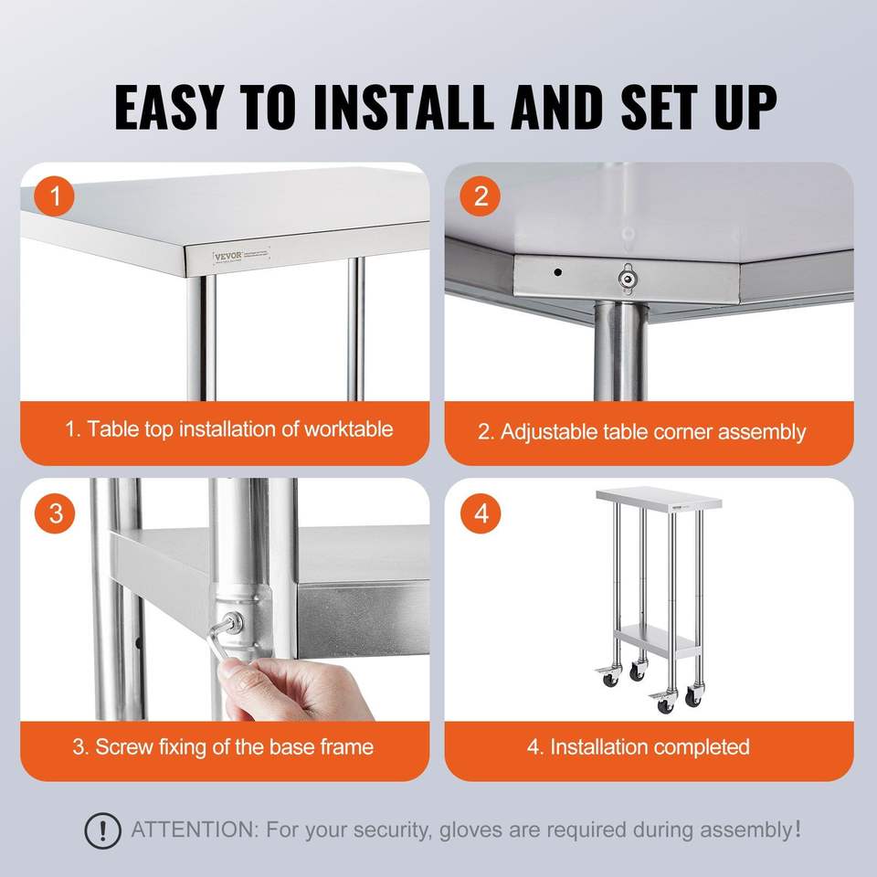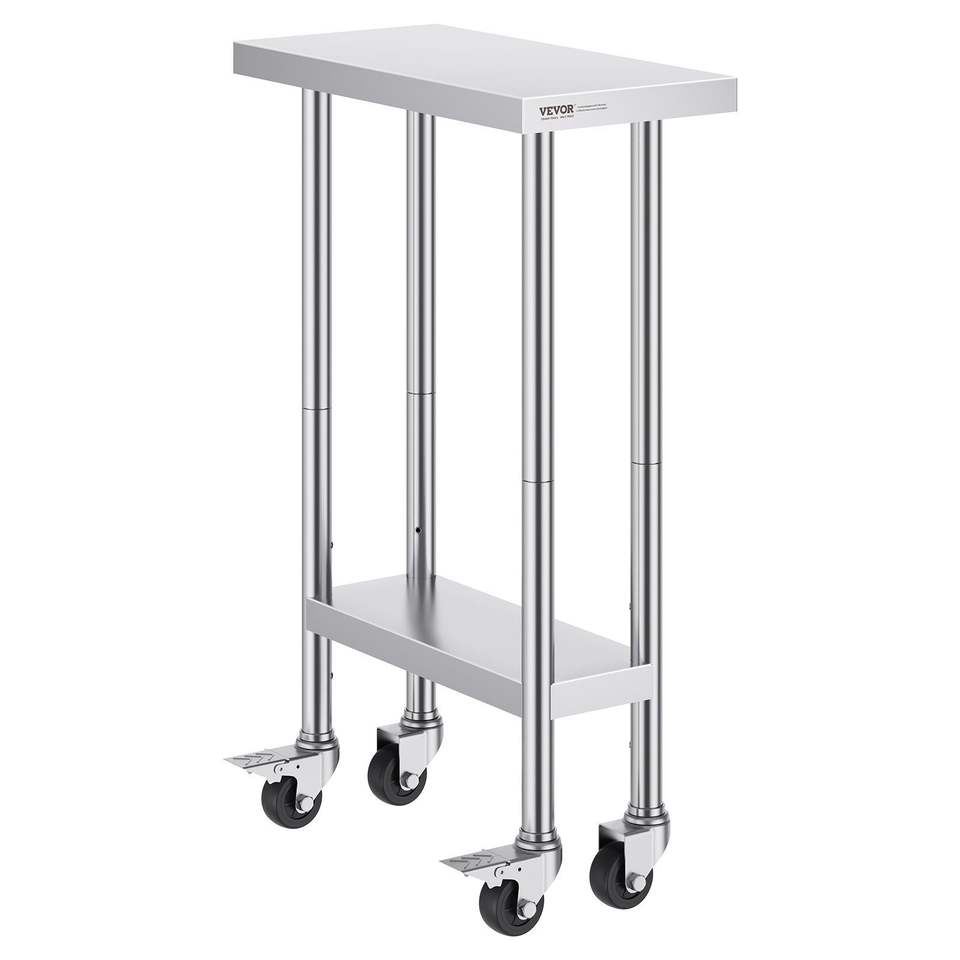 Tavolo da Lavoro in Acciaio Inox Resistente 24 X 12 X 38 Pollici, Capacità di Carico 500 LBS, 4 Ruote, 3 Altezze Regolabili, per Cucina Commerciale