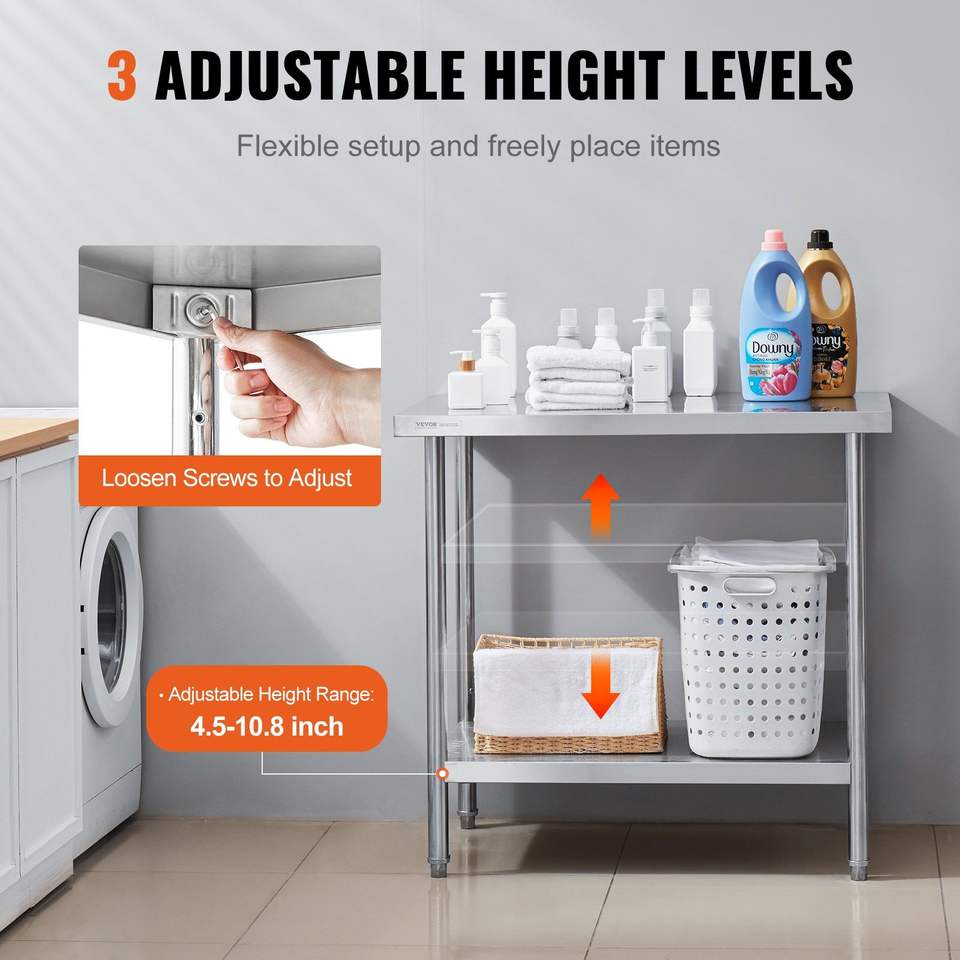 Tavolo da Preparazione Resistente 24 X 36 X 34 Pollici, Capacità di Carico 750 Libbre, 3 Livelli di Altezza Regolabili, in Acciaio per Cucine Commerciali