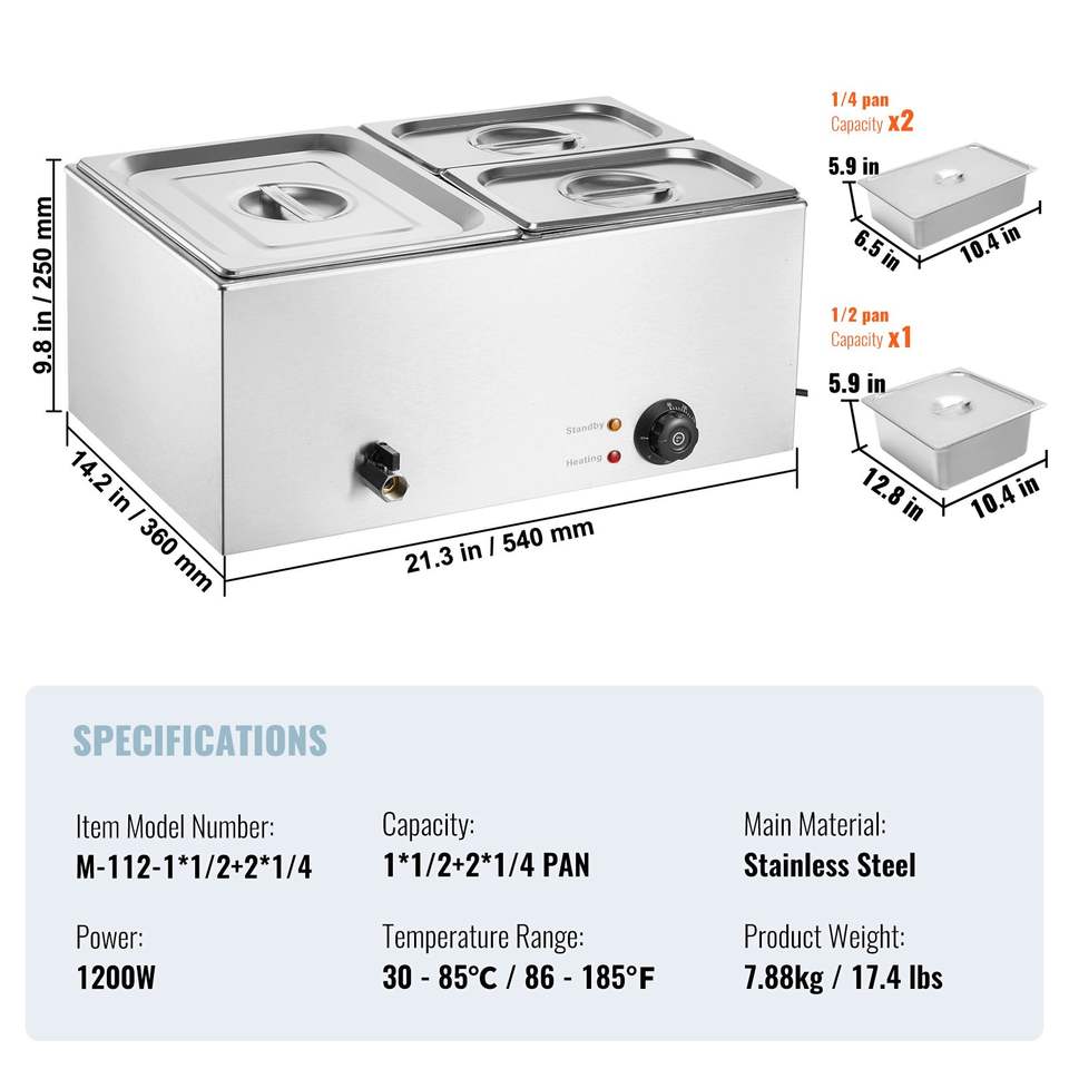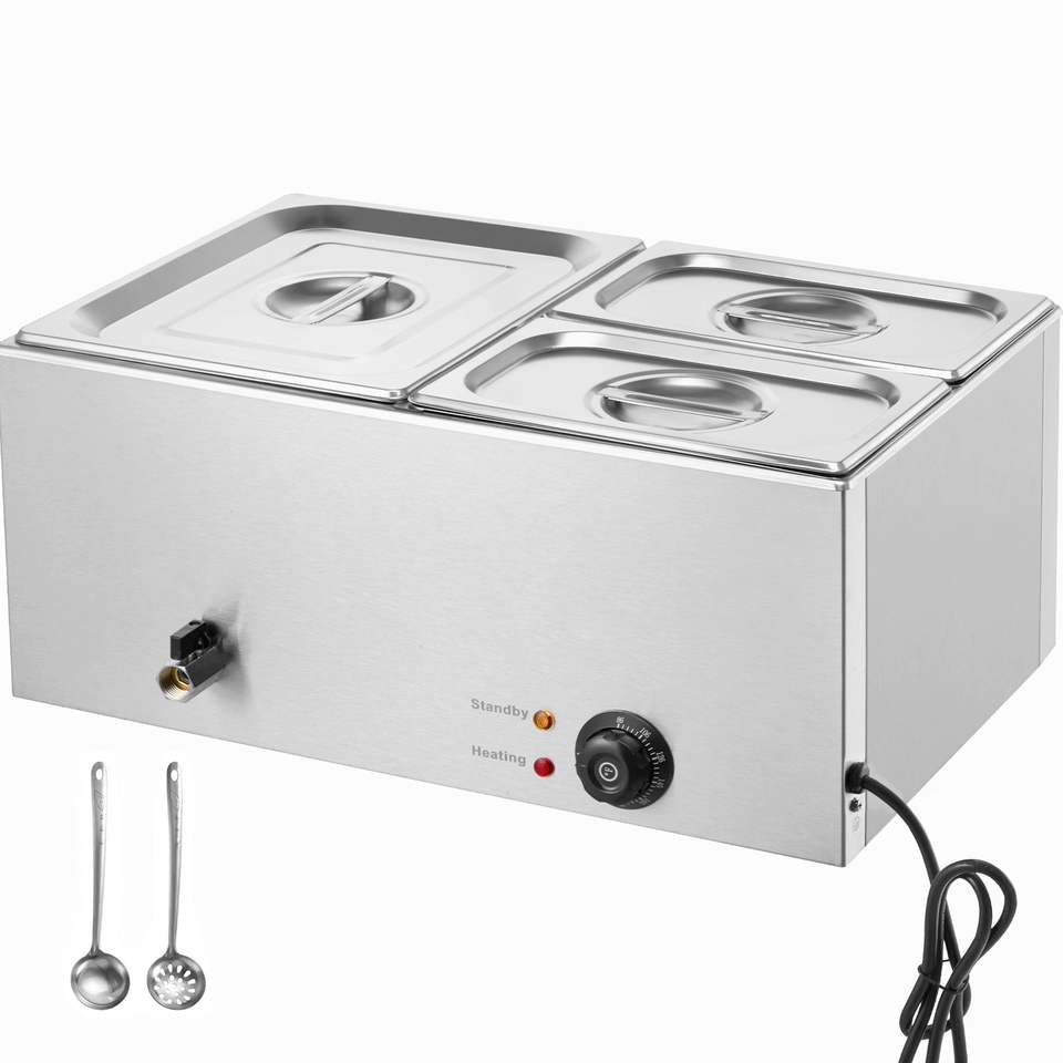 Bain Marie Commerciale in Acciaio Inox da 24QT, 8x1200W, Professionale da Banco, Attrezzatura Elettrica per Mantenimento Caldo a Vapore con 3 Vasche