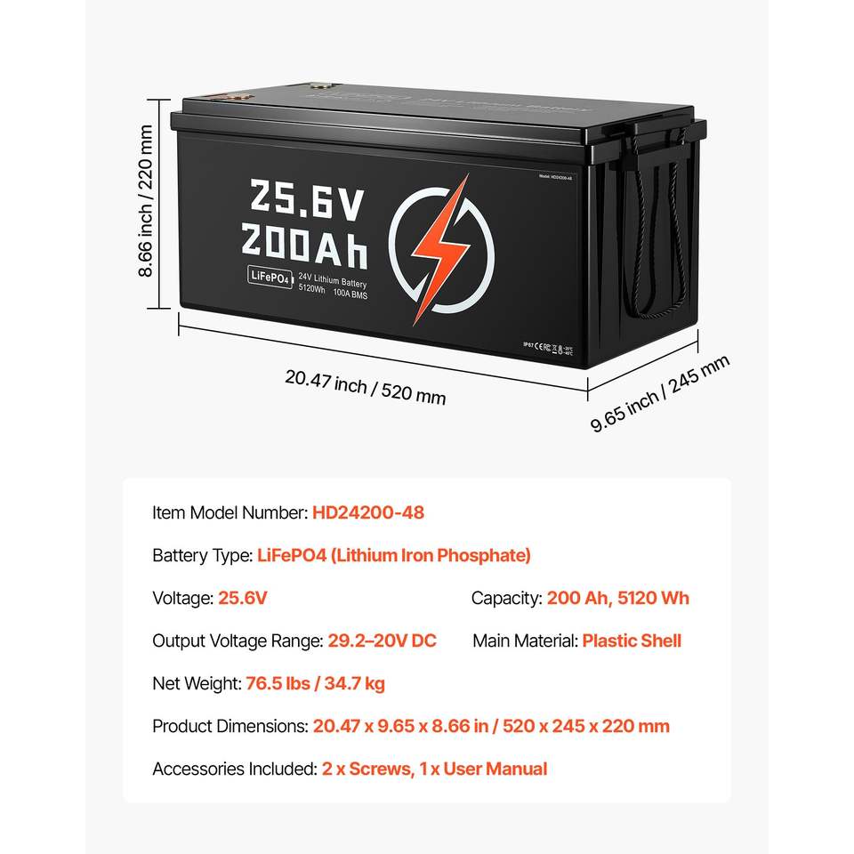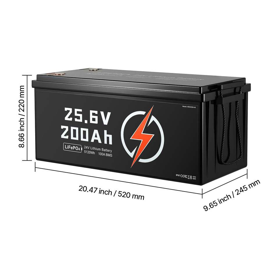 Batteria al Litio LiFePO4 24V 200Ah con BMS 100A, Ciclo Profondo, Ricaricabile, Protezione da Basse Temperature e Applicazioni, Modello D0100XU4ZGG