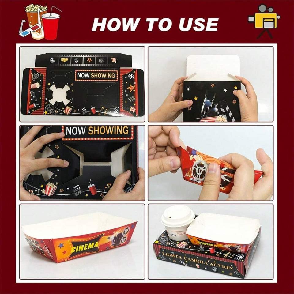 24pcs Movie Night Combo Trays Paper Food & Cardboard Popcorn Drink Holder Cinema Pattern for Birthday Carnival Party Supplies
