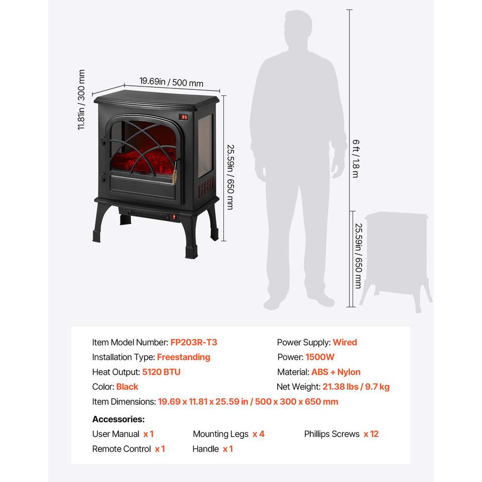Caminetto Elettrico Portatile da 25,5 Pollici, Stufa Riscaldante 1500W 5120BTU con Protezione dal Surriscaldamento e Funzioni Regolabili
