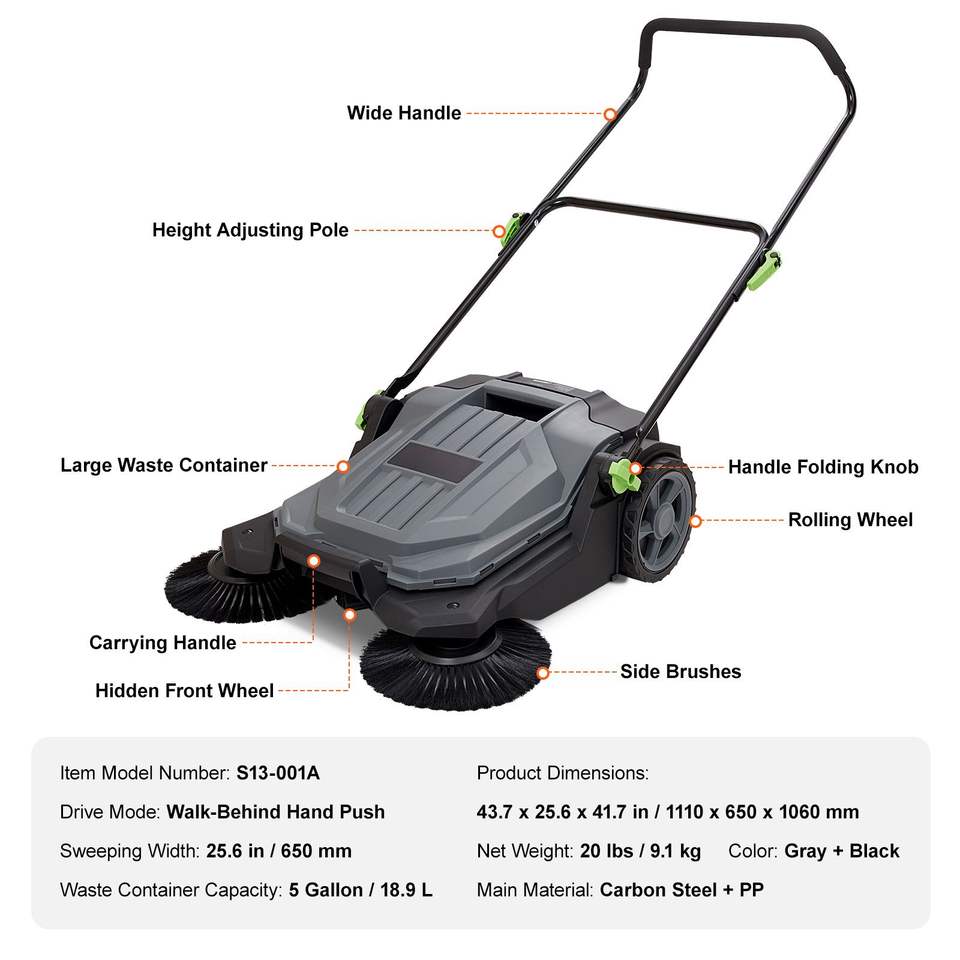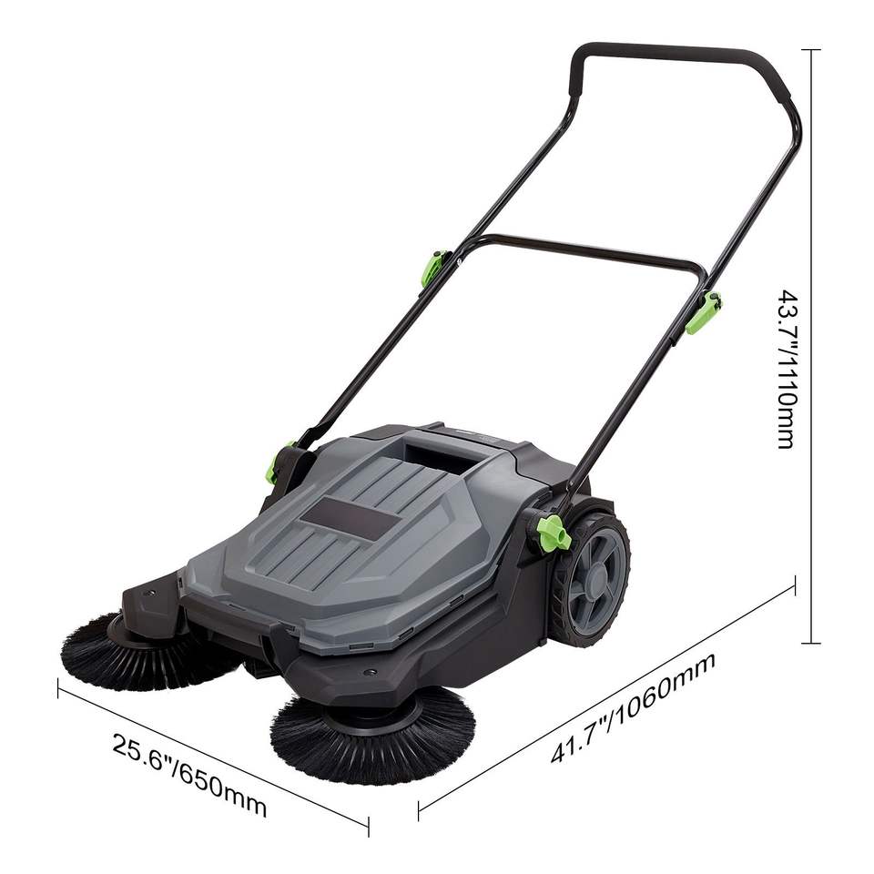 Spazzatrice manuale da 25,6 pollici con contenitore angolare non elettrico da 5 galloni e larghezza di spazzamento manuale