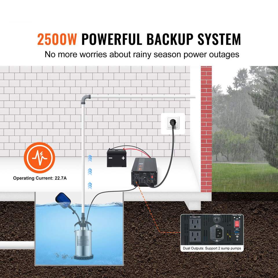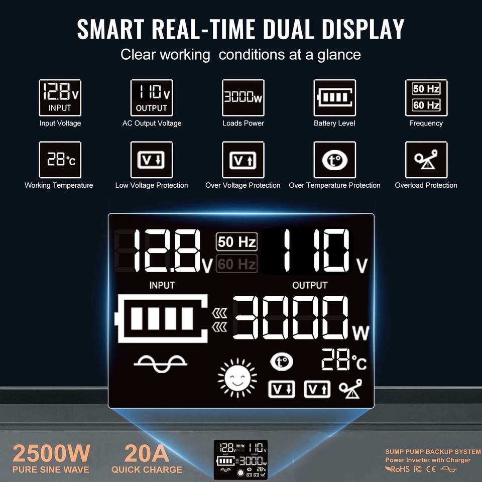 Sistema di Alimentazione Continua UPS da 2500W con Display LCD e Interruttore Automatico per Pompa di Drenaggio con Batteria di Backup