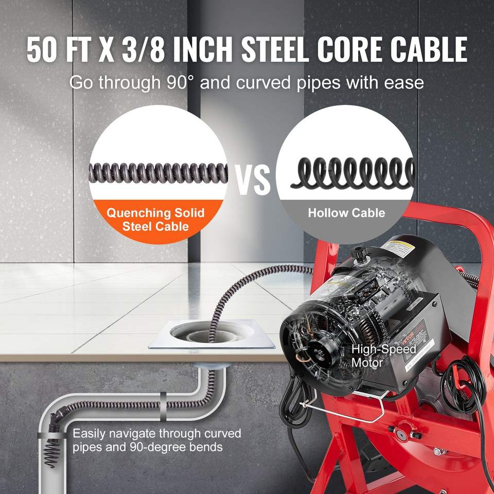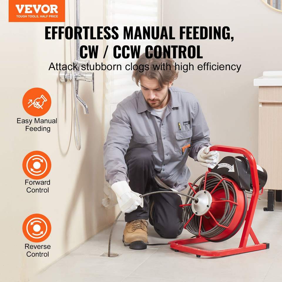 Macchina Elettrica per la Pulizia degli Scarichi da 250W, Spirale per Fognature da 50FT x 3/8 Pollici con Alimentazione Manuale, 4 Frese, Macchina Puliscitubi a Alimentazione Manuale