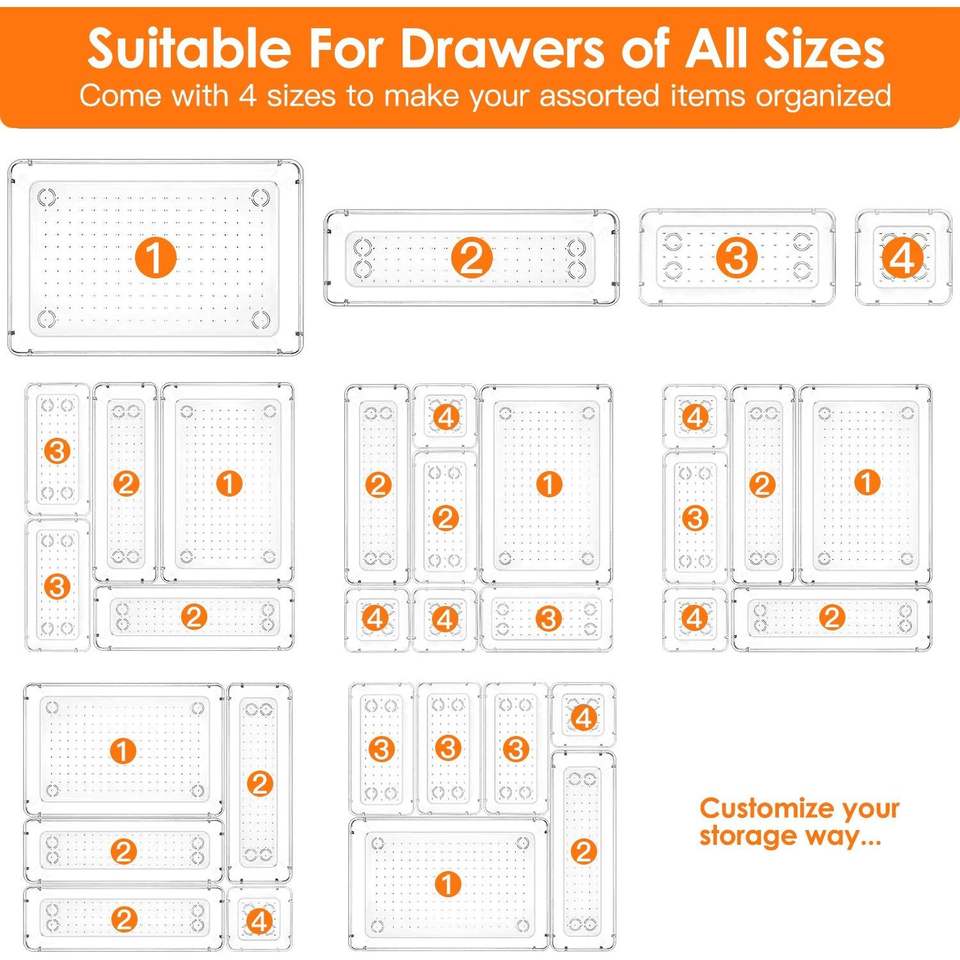 Set di 25 Organizzatori per Trucchi in Plastica Trasparente, 4 Misure, Divisori per Cassetti, Vassoi e Contenitori
