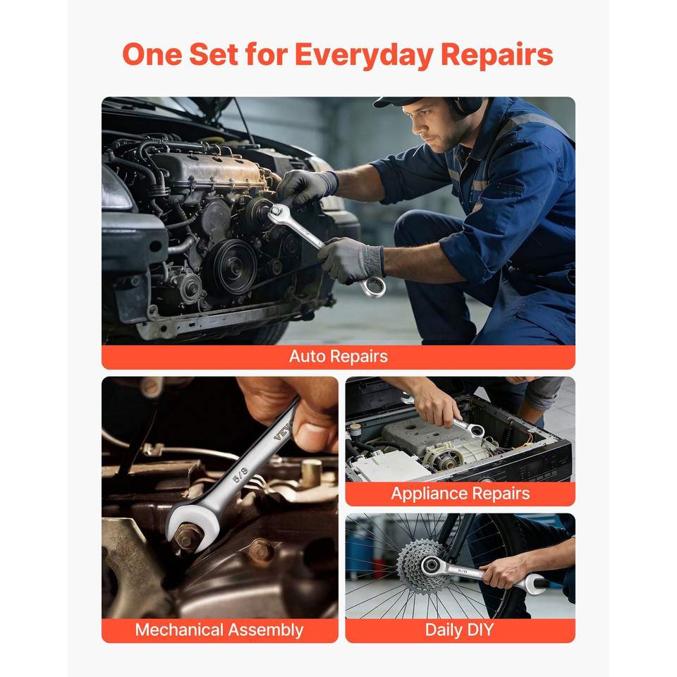 Set di chiavi combinate metriche SAE da 26 pezzi con cricchetto a 72 denti in acciaio Cr-V e organizer a rack