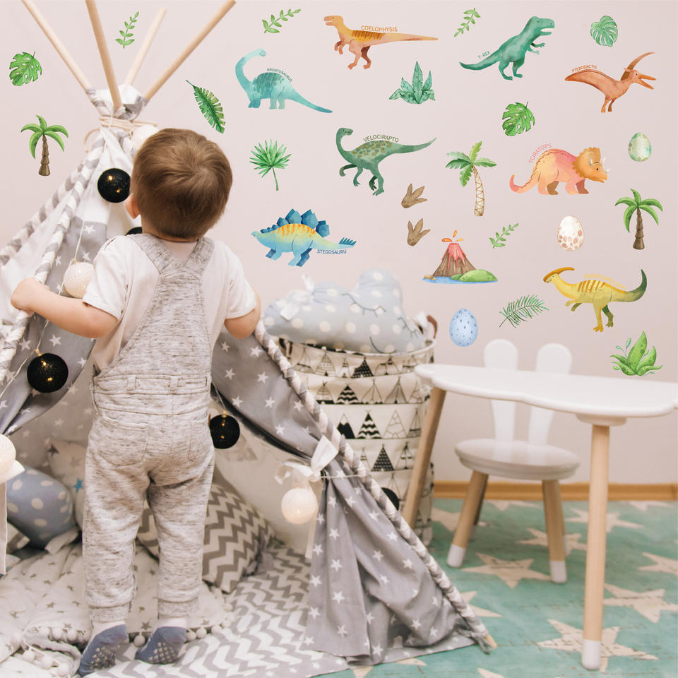 28 pz dinosauro adesivo da parete foresta cartone animato acquerello impermeabile decalcomanie per camera dei bambini PVC decorazione adesivi murali per bambini