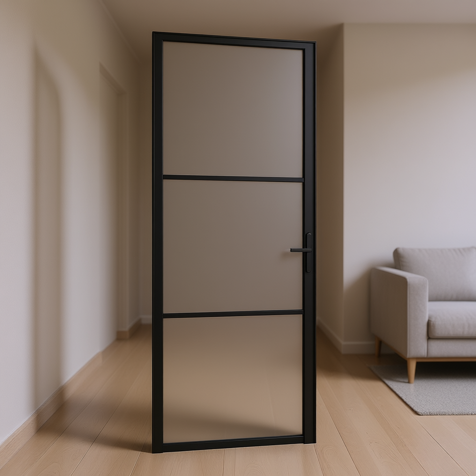 Porta Interna Moderna in Alluminio con Vetro Nero Opaco 29.9x79.3 Pollici, Design Minimalista, Isolamento Acustico, Superficie Rifinita