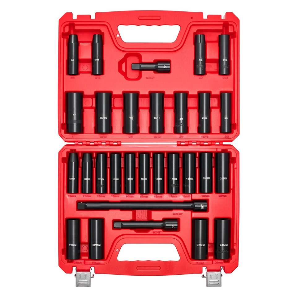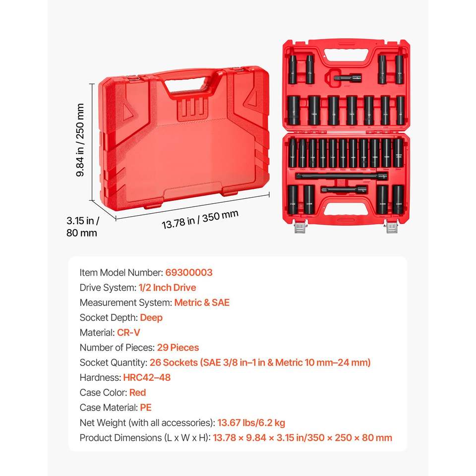 Set di 29 Pezzi per Riparazione Auto, Chiavi a Bussola a Impatto da 1/2 Pollice, Set di Bussole Profonde a 6 Punte, Misure SAE (3/8 1 Pollice) e Metriche (10-24 mm)