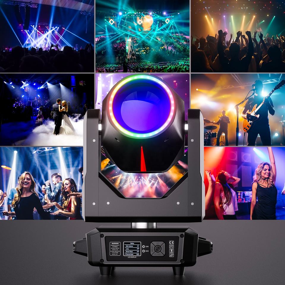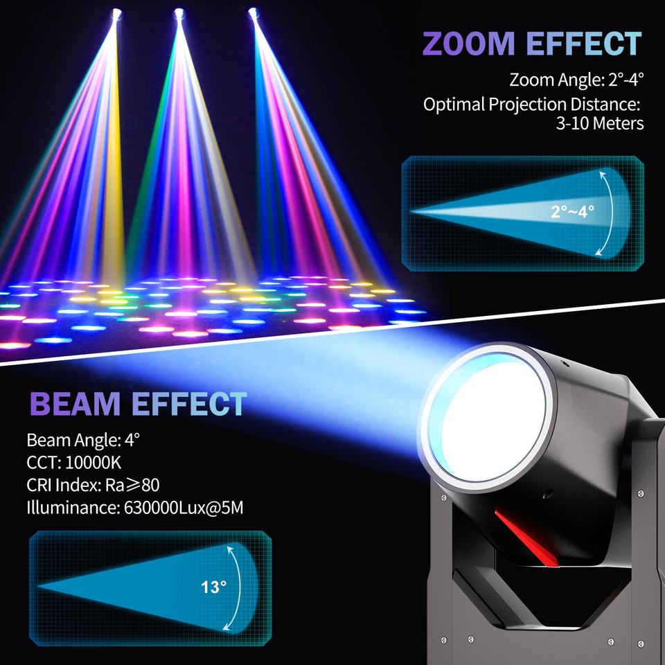 Fonte luminosa HID da 295W: Fornisce un'uscita luminosa ad alta intensità di 630.000 Lux a 5 metri, ideale per grandi palchi e illuminazione a lunga distanza.