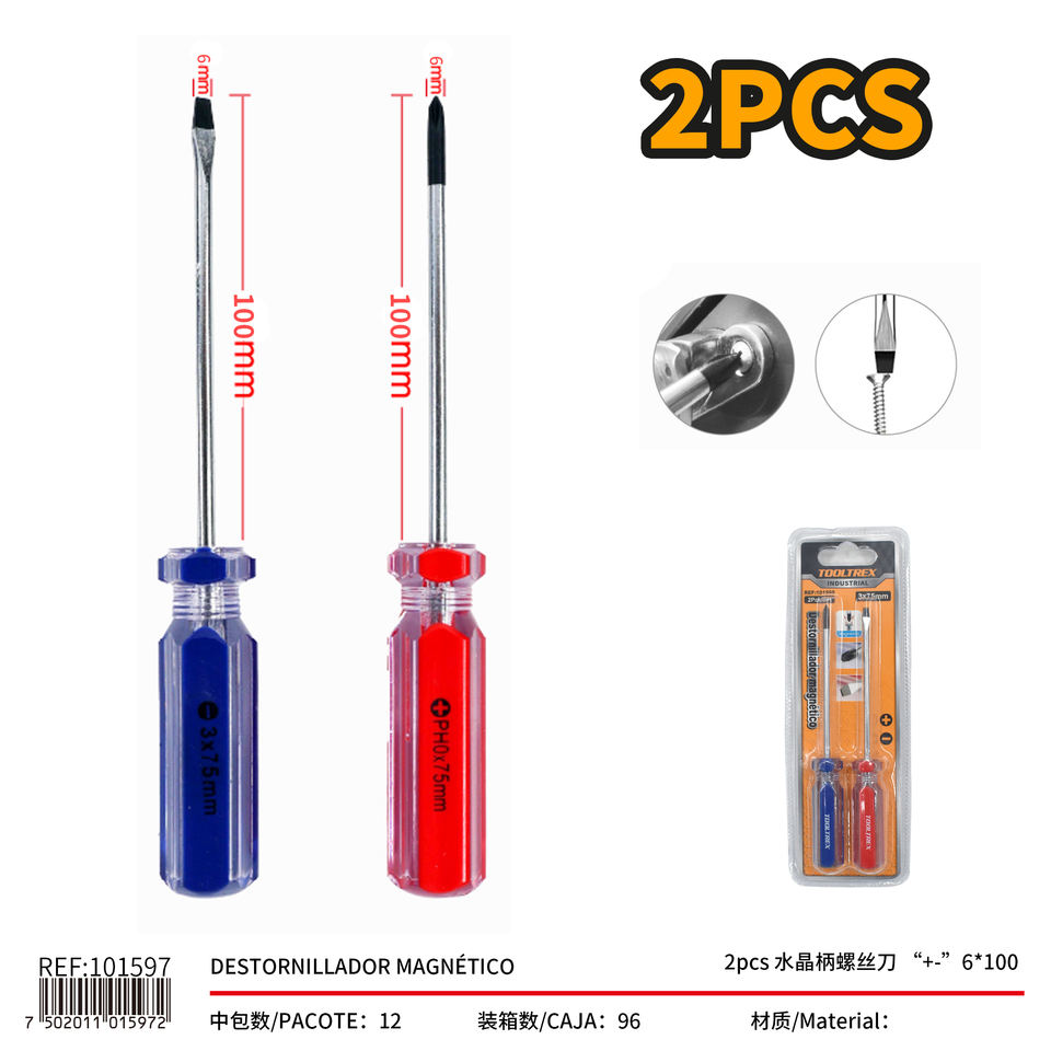 Screwdriver Set 6x100mm Magnetic Tip Phillips Slotted Chrome Finish Plastic Handle Industrial DIY Tools