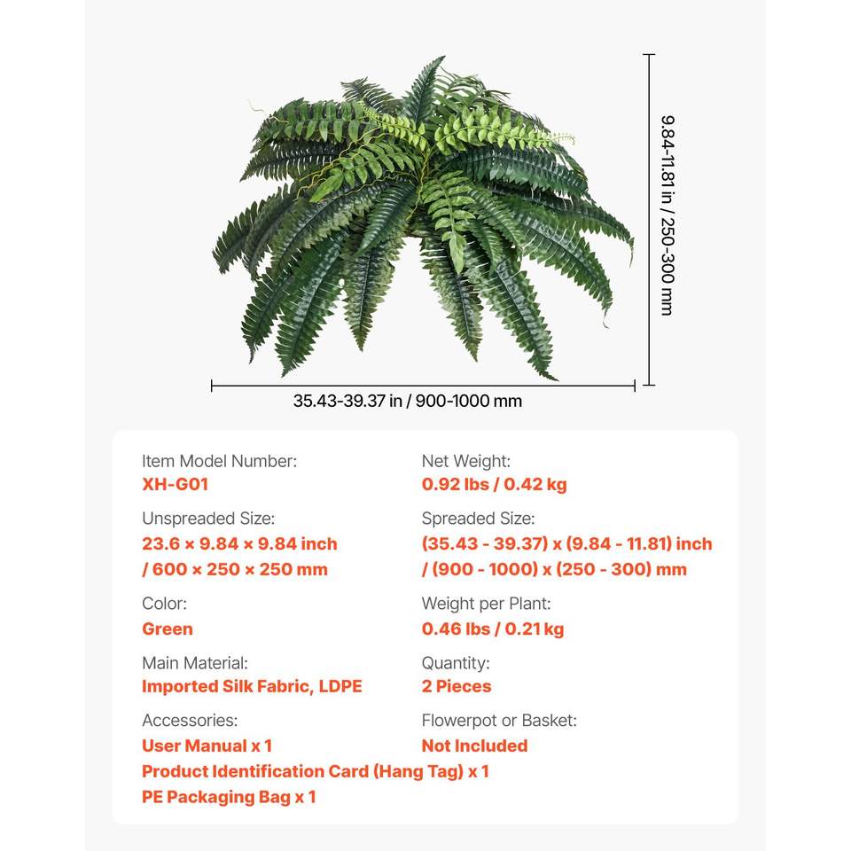 2pcs Large Hanging Artificial Boston Ferns 35-39 Inch Spread Natural Spread Diameter 35-39 Inch Fake Plant Wall Decor 3