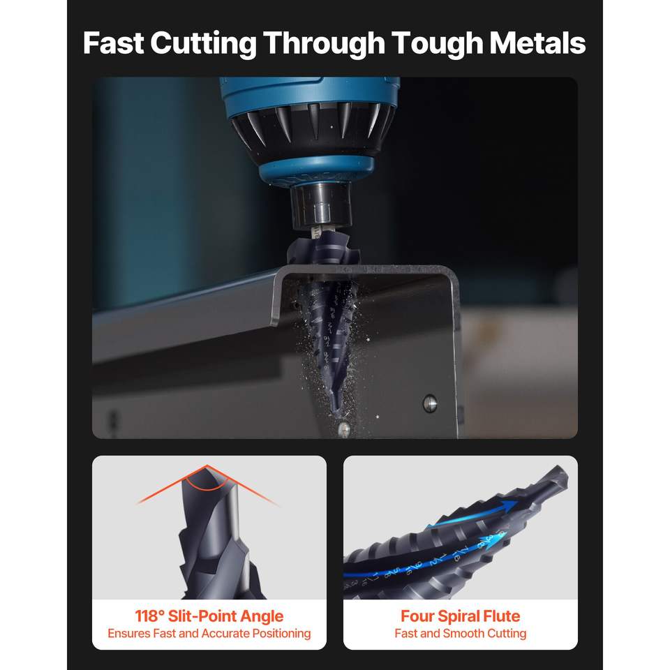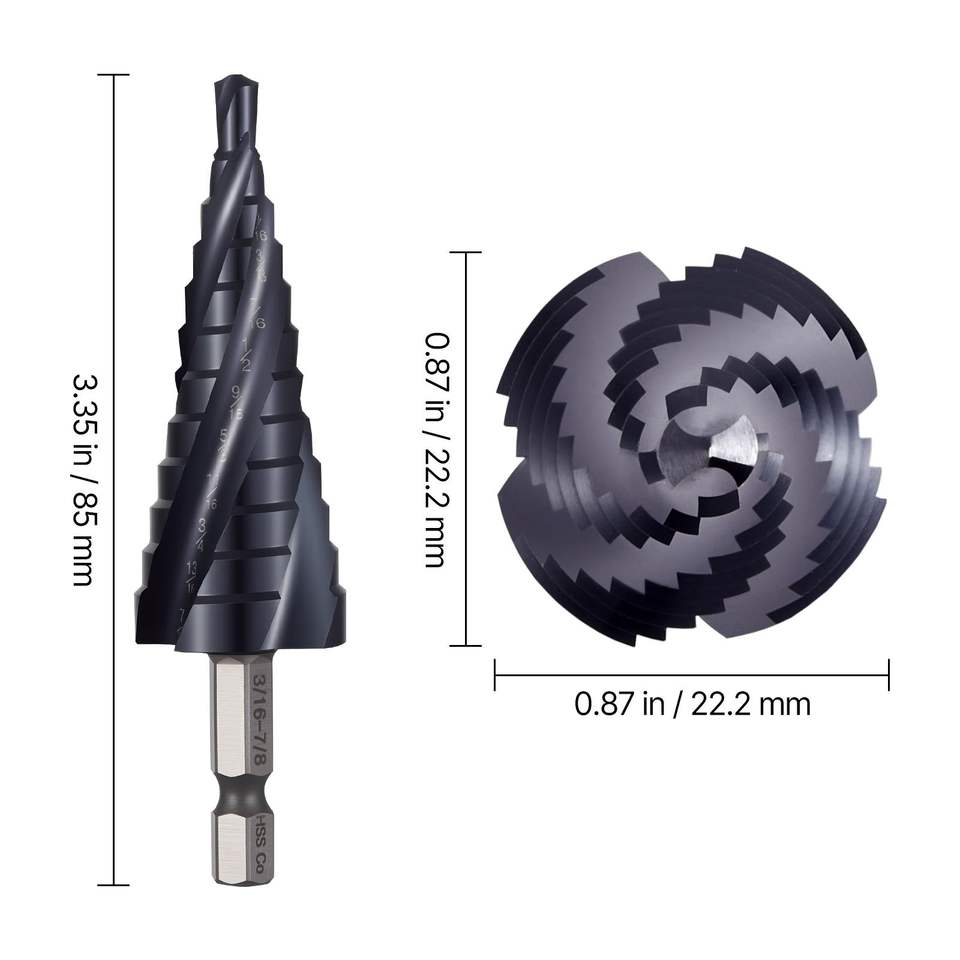 Punta da trapano a gradini in acciaio HSS cobalto da 3/16 e 7/8 pollici, con codolo esagonale da 1/4 di pollice, rivestimento TiAlN, a quattro spirali, multiuso