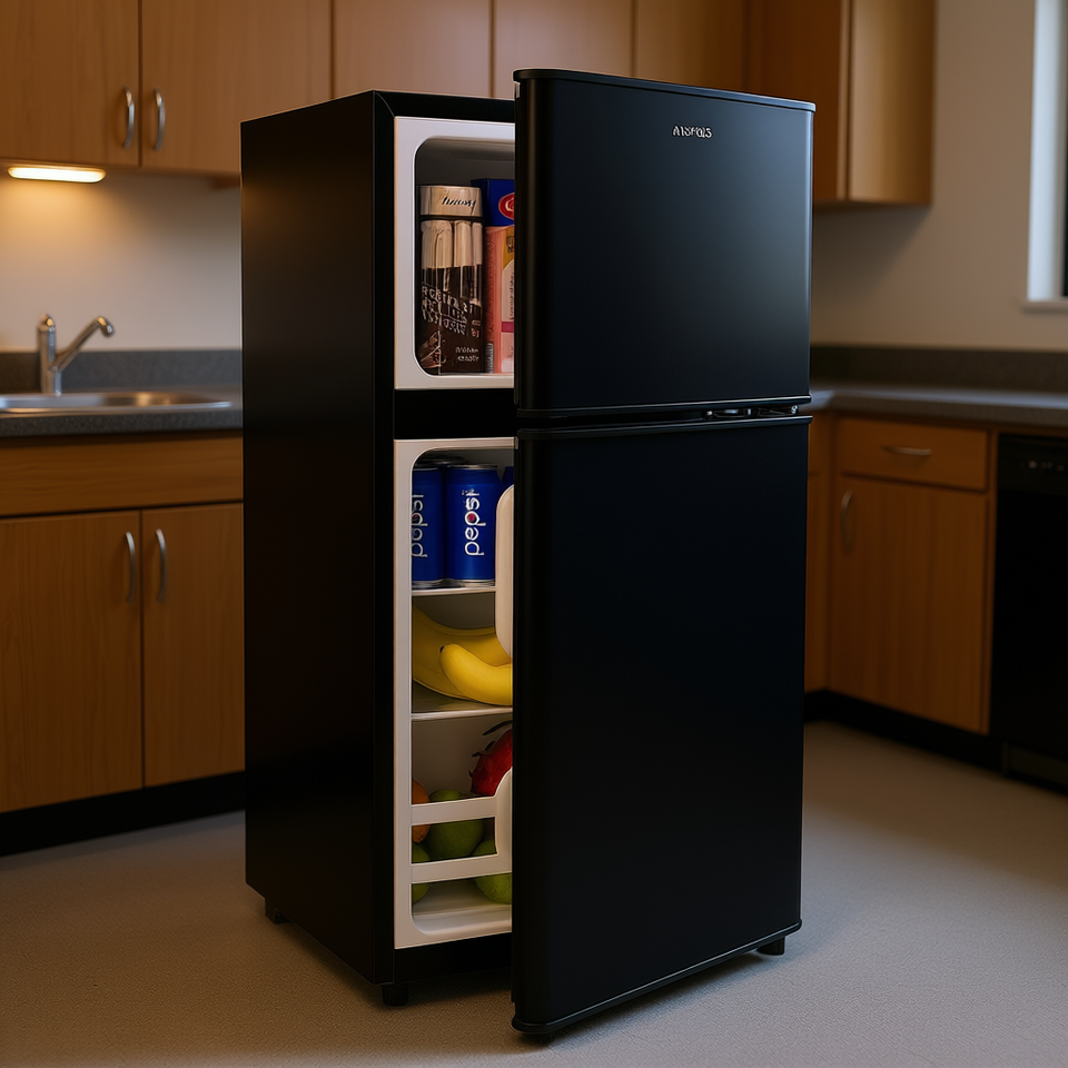 Compact 2-Door Mini Fridge Freezer 3.5 Cu.Ft With Removable Shelves Auto-Defrost Black Color Steel Plate ANUKIS For Kitchen Dorm