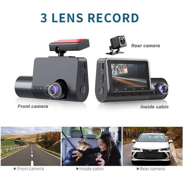 Dash Cam a 3 Canali con Telecamere 1080p + 1080p + 480p, Tre Obiettivi Grandangolari con Campo di Monitoraggio di 140 Gradi + 140 Gradi + 130 Gradi