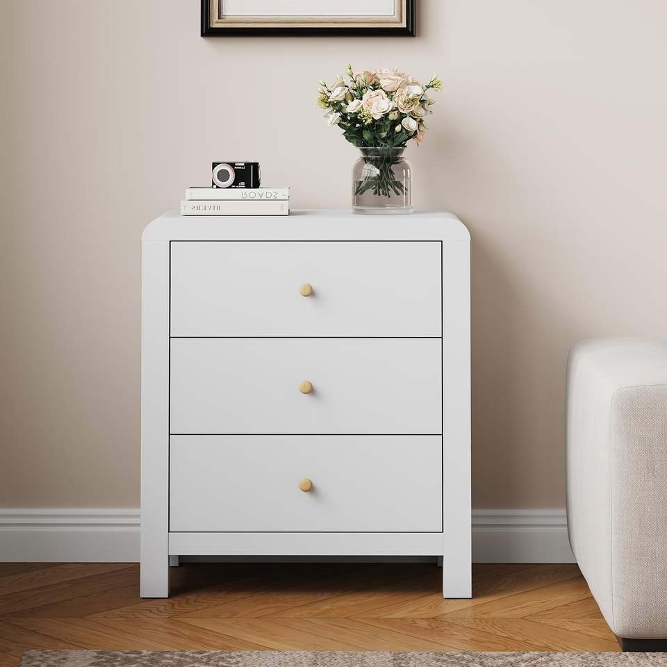 Comò a 3 cassetti, cassettiera moderna con angoli arrotondati del tavolo, comodino in legno