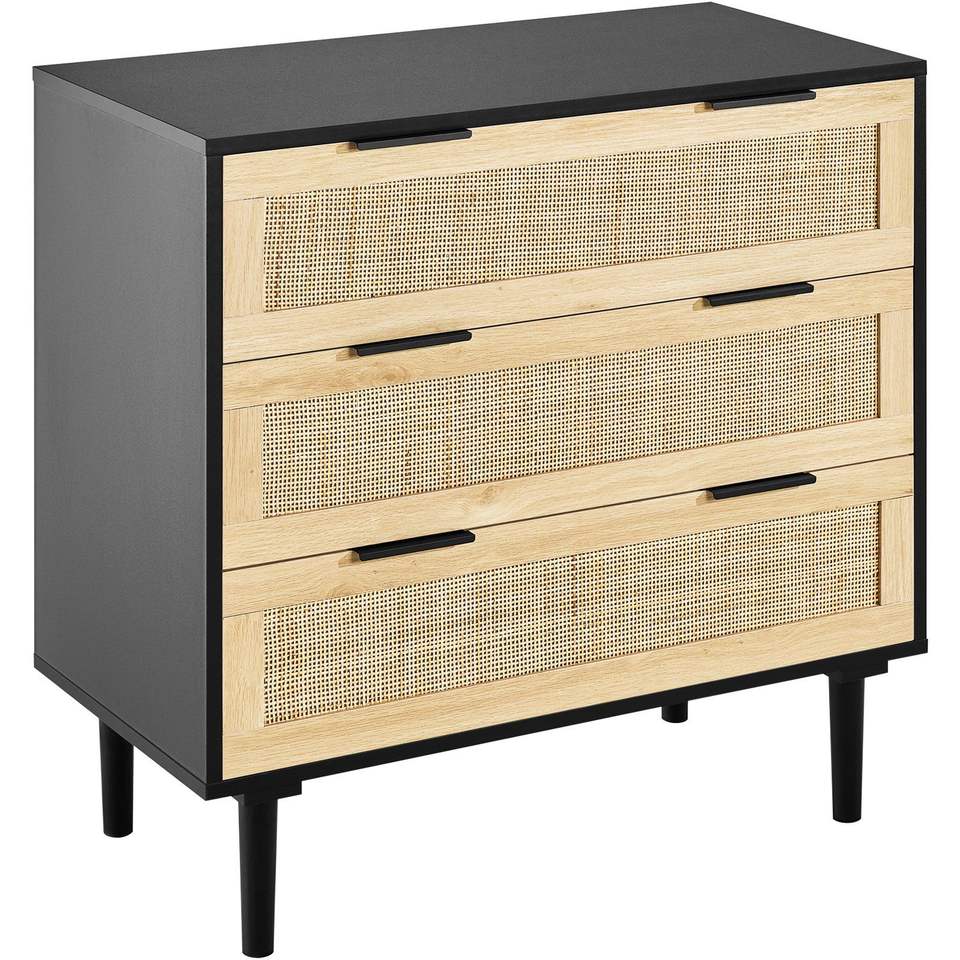 Cassettiera Moderna a 3 Cassetti in Legno Naturale e Rattan, Stile Boho, Organizzatore per Vestiti, Mobile Contenitore