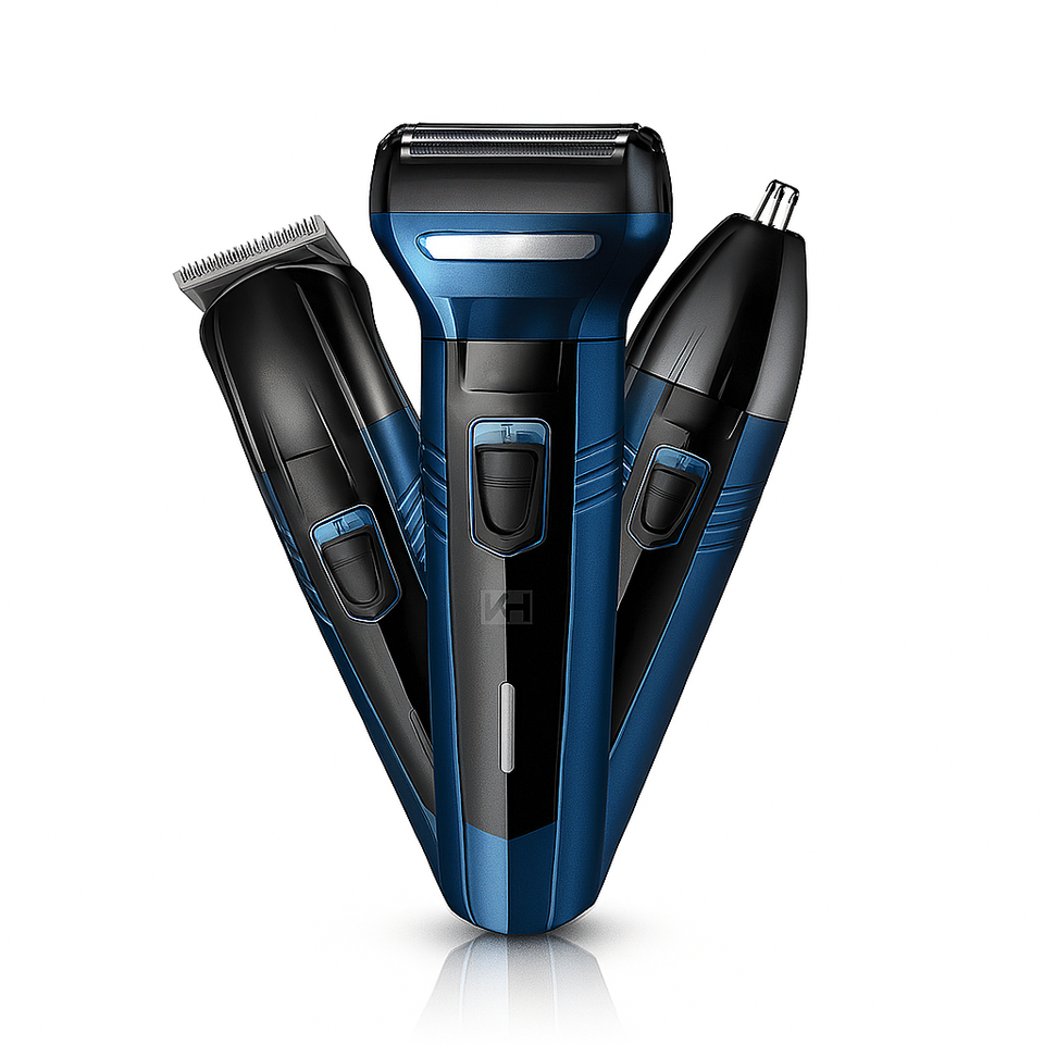 Kit di Toelettatura Elettrico Ricaricabile 3-in-1 in Acciaio Inox per Uomo, Regolabarba Portatile con Ricarica USB, Supporto in Inglese