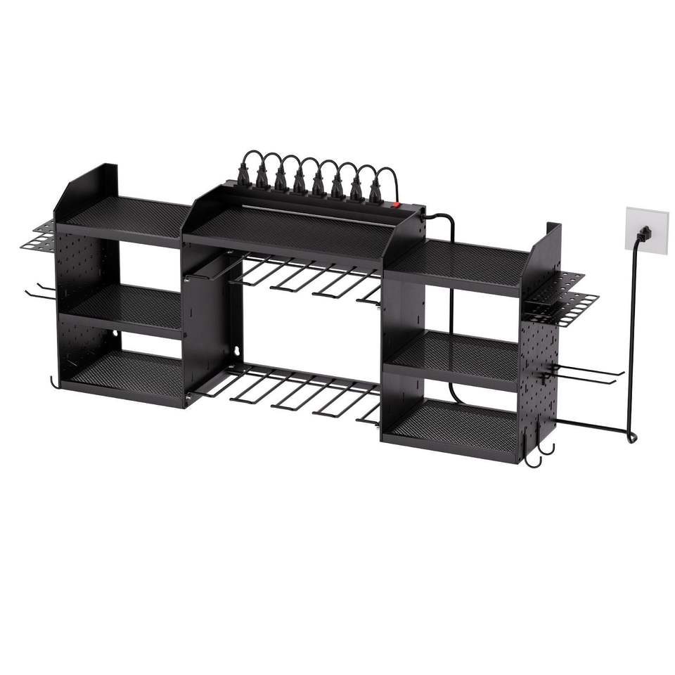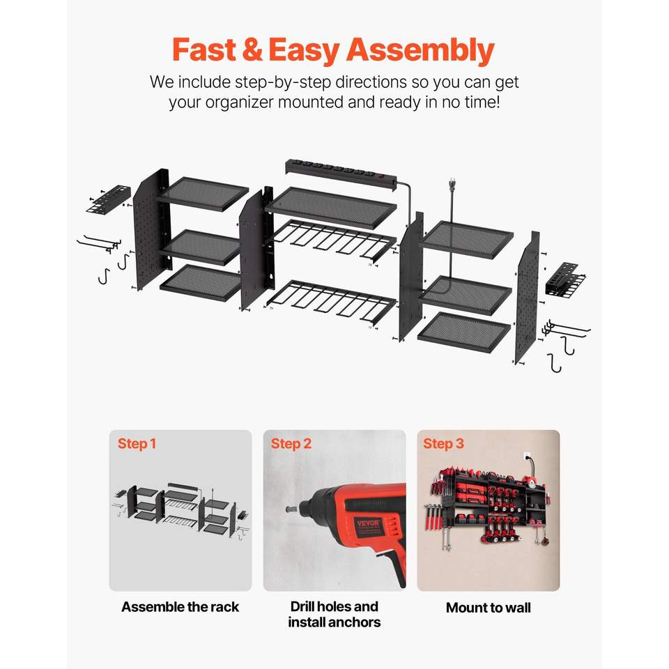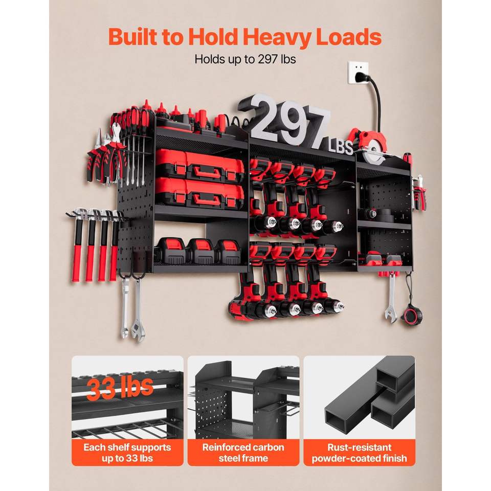 3-Layer Power Tool Organizer Charging Station 5.58 ft Wall-Mounted Storage Rack with 8 Drill Holders and Power Strip